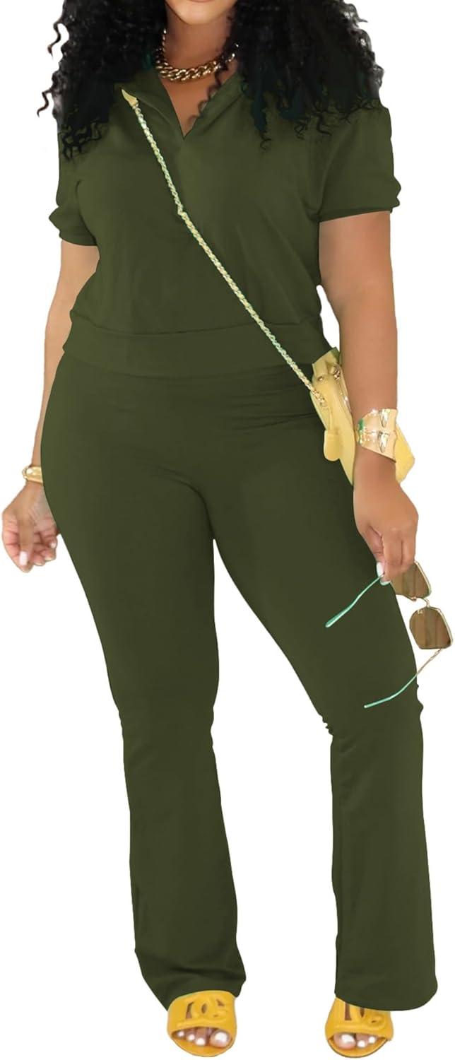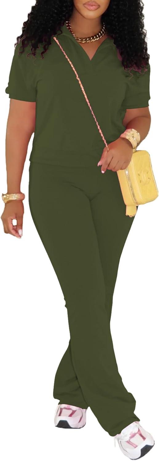 PINSV 2 Piece Sets For Women Casual V Neck Lounge Sets Short Sleeve Top Flare Pants Daily Tracksuit(Army Green)