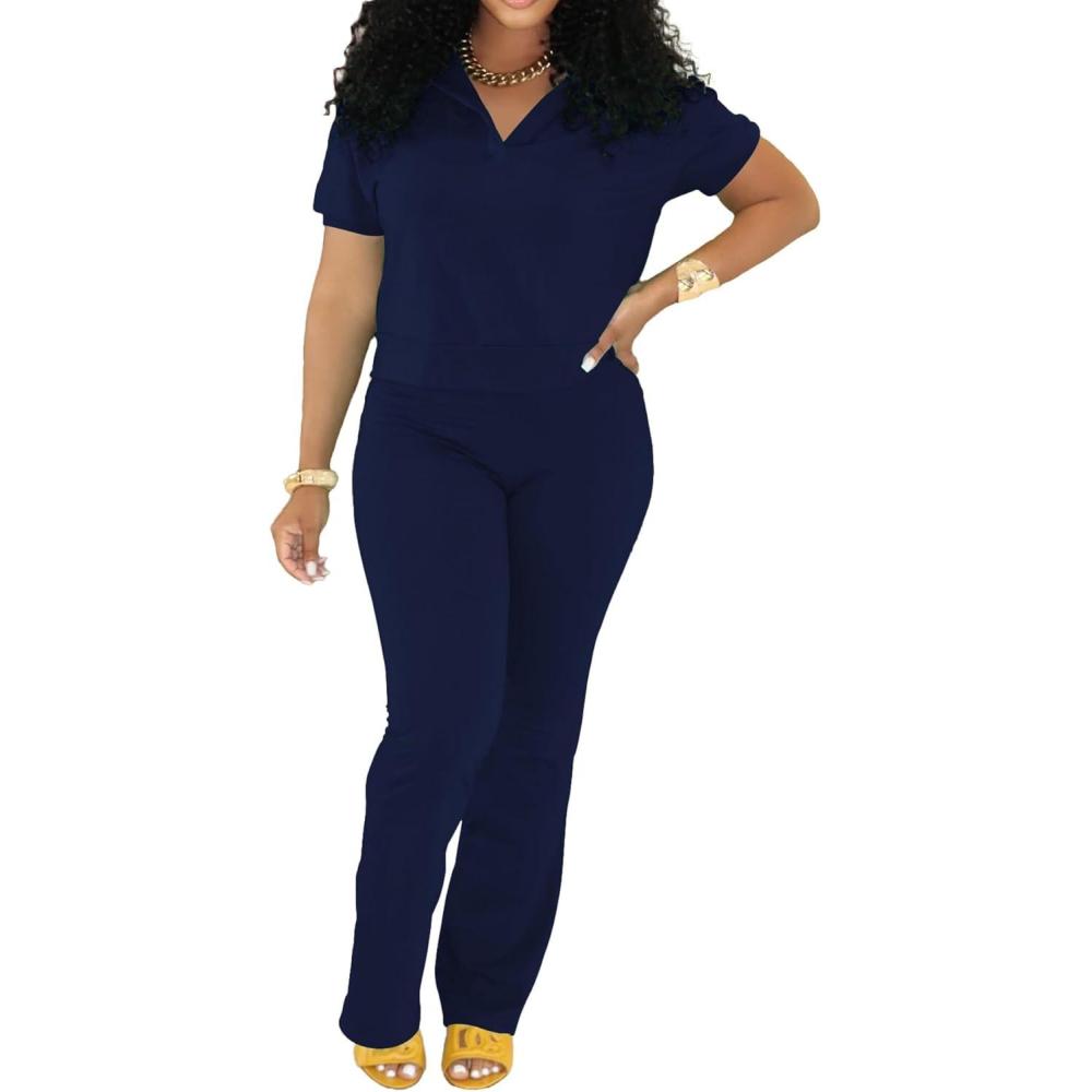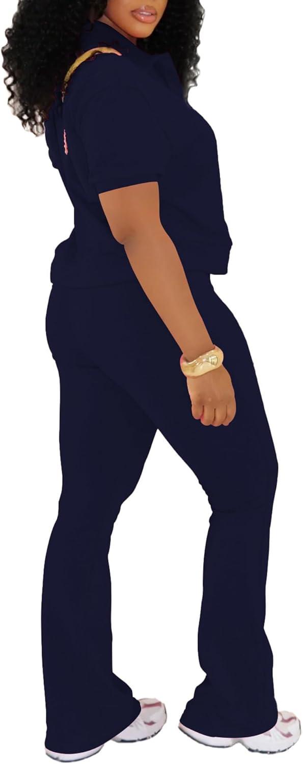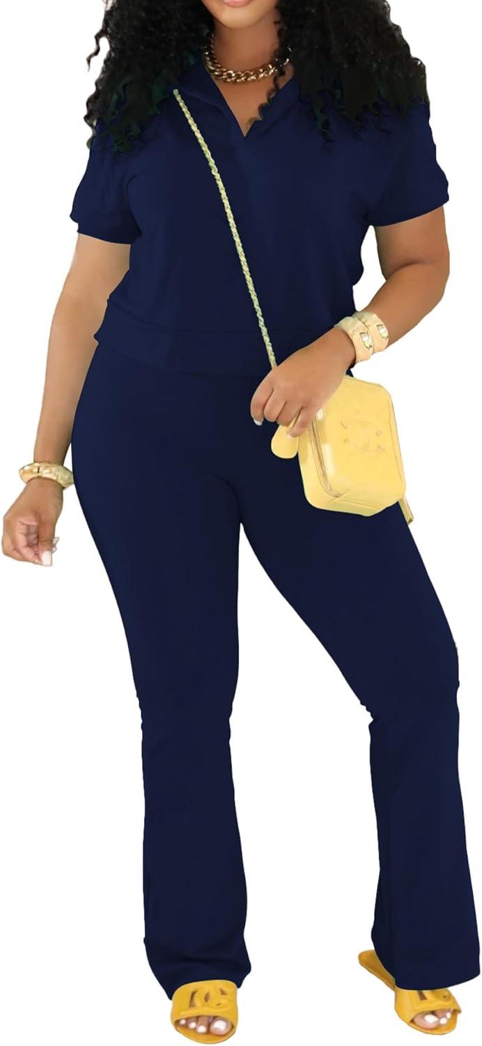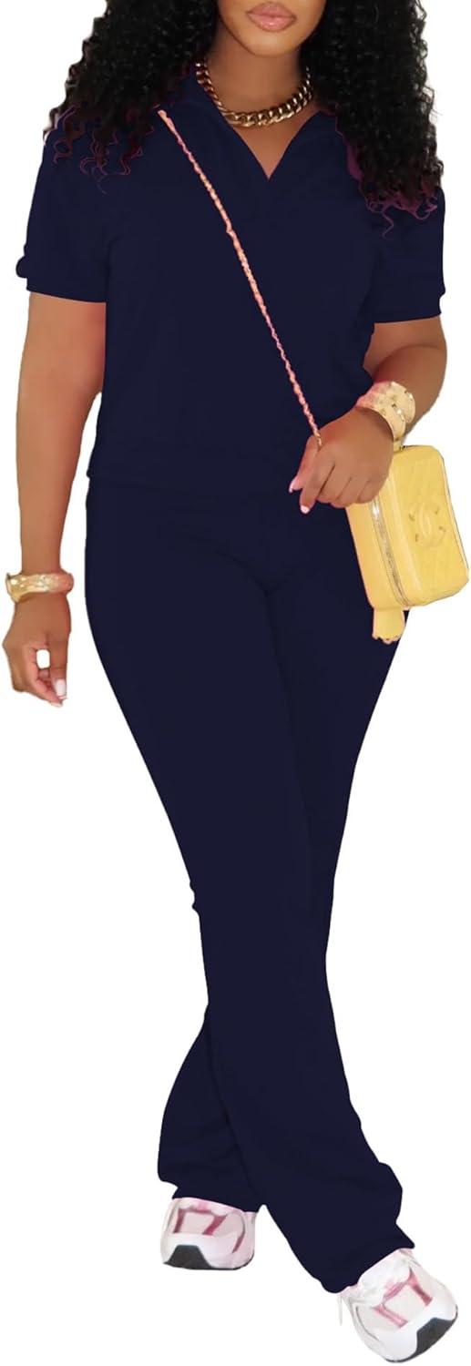 PINSV 2 Piece Sets For Women Casual V Neck Lounge Sets Short Sleeve Top Flare Pants Daily Tracksuit(Dark Blue)