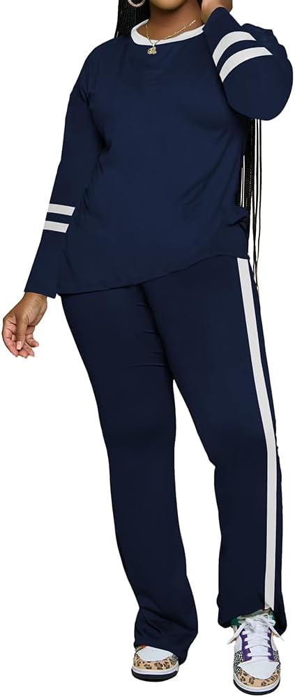 PINSV 2 Piece Sets for Women Fall Casual Outfits Long Sleeve Top and Flare Pants Lounge Sets Track suit(Dark Blue)