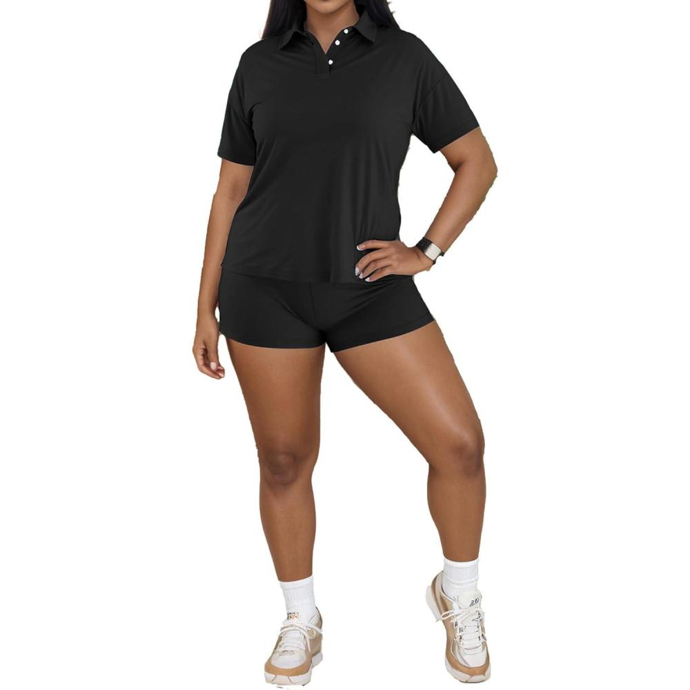 PINSV 2 Piece Sets for Women Short Sleeve Polo Shirts Shorts Outfit Tracksuit Summer(Black)