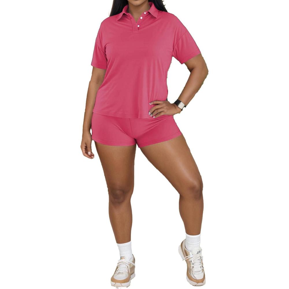 PINSV 2 Piece Sets for Women Short Sleeve Polo Shirts Shorts Outfit Tracksuit Summer(Pink)