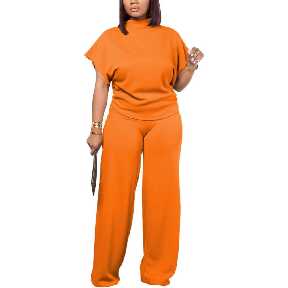 PINSV Lounge Sets For Women Casual 2 Piece Outfits Baggy Short Sleeve Top And Flare Pants Tracksuits(Ug-orange)
