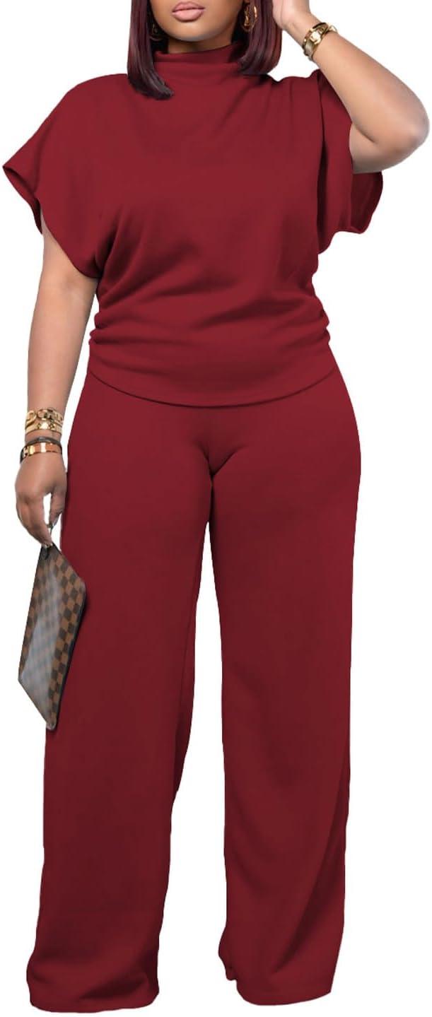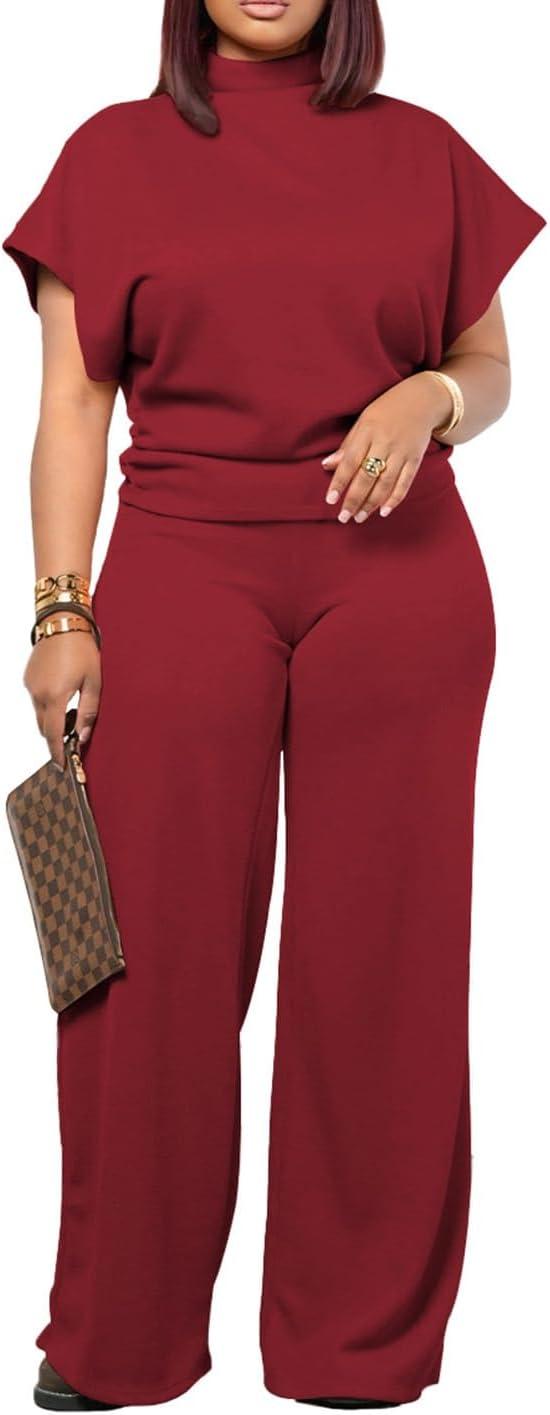 PINSV Lounge Sets For Women Casual 2 Piece Outfits Baggy Short Sleeve Top And Flare Pants Tracksuits(Ug-wine Red)