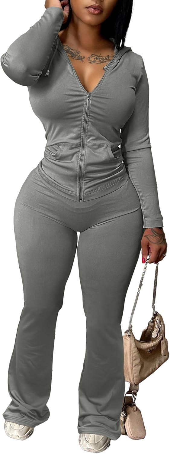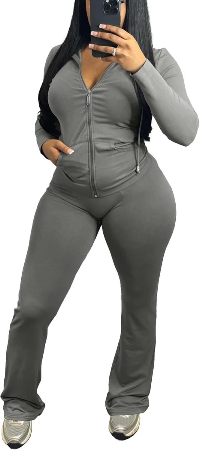 Don’t break the bank! Get the PINSV Women 2 Piece Outfits Workout Bodycon Tracksuit Long Sleeve Zip Up Hoodie Jacket Matching Flared Pants Sets(Grey) you want at a price you can afford during our markdown sale.