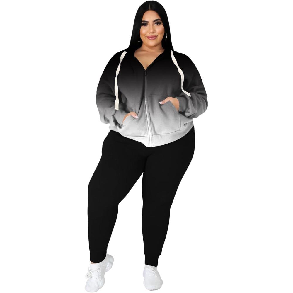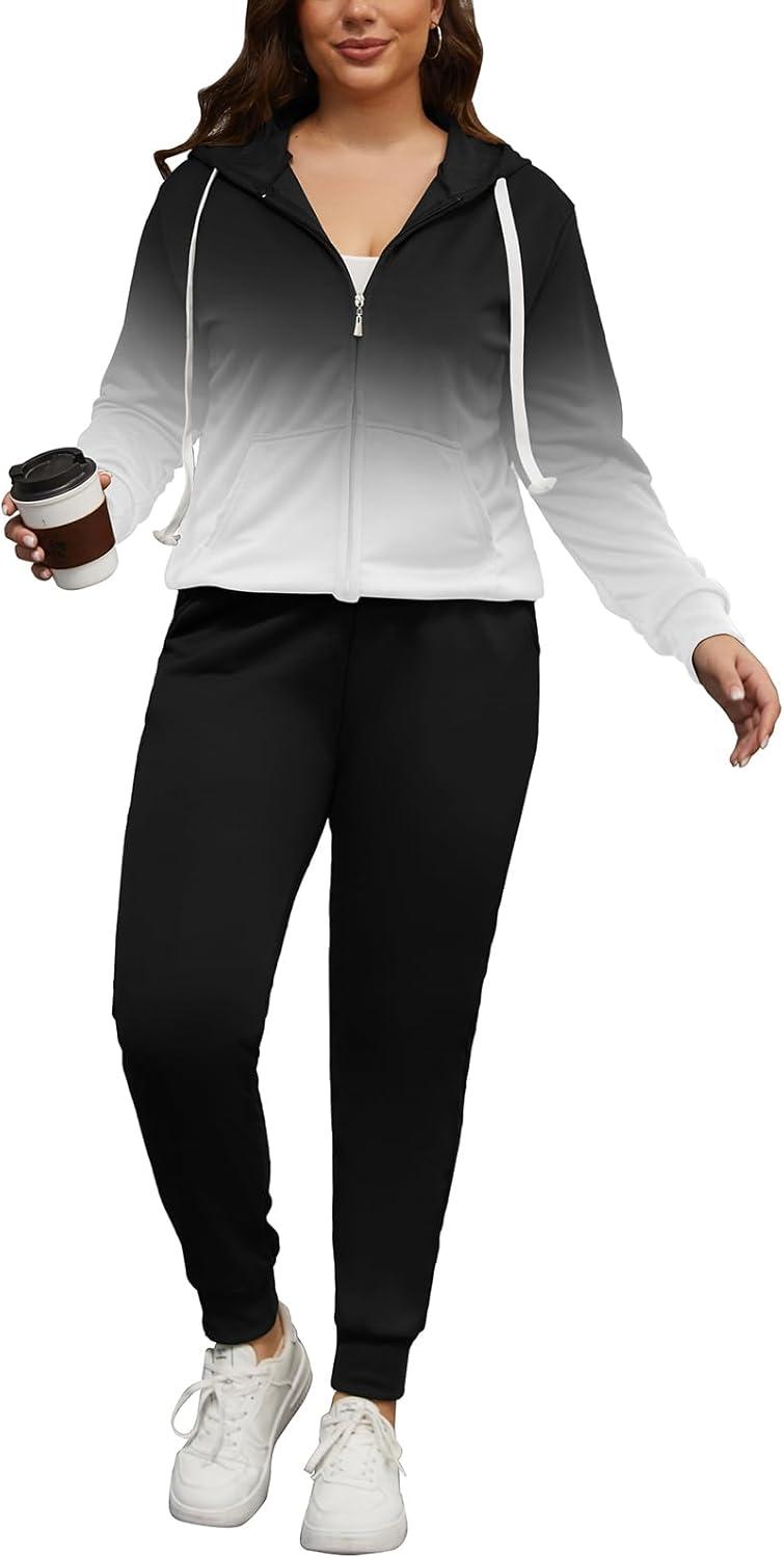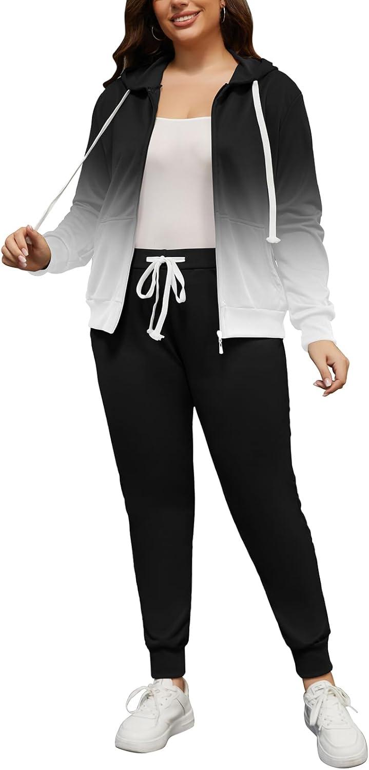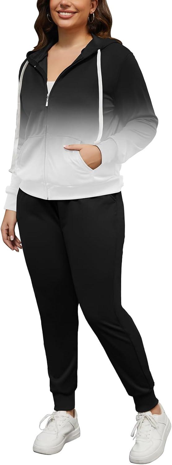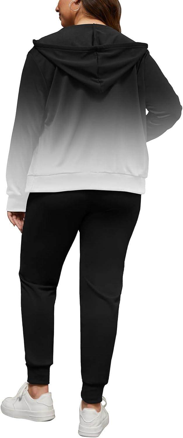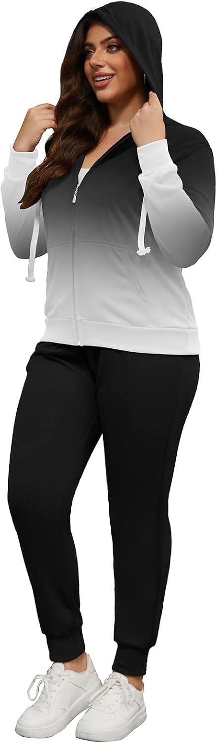 PINSV Women Plus Size 2 Piece Outfits Sweatsuits Full Zip Hooded Sweatshirt Sweatpants Tracksuits(B-black Gradient)