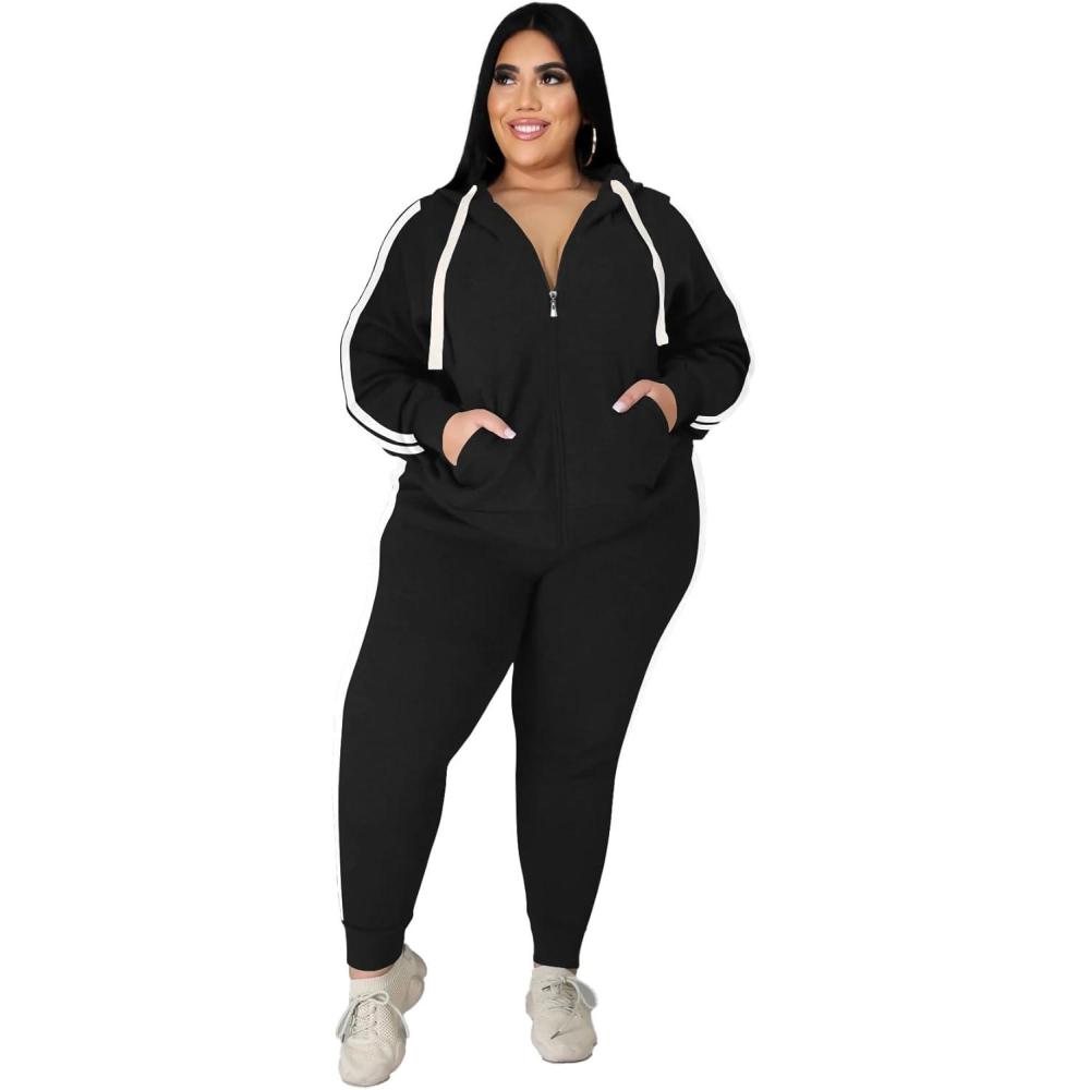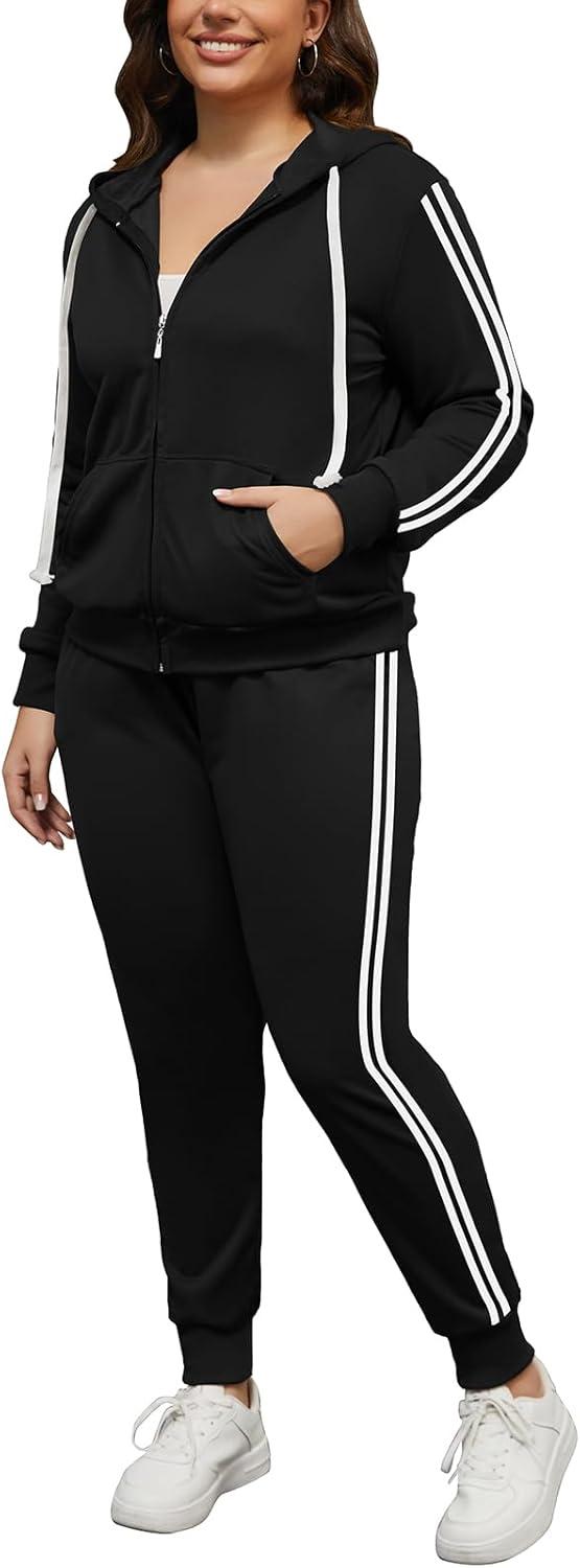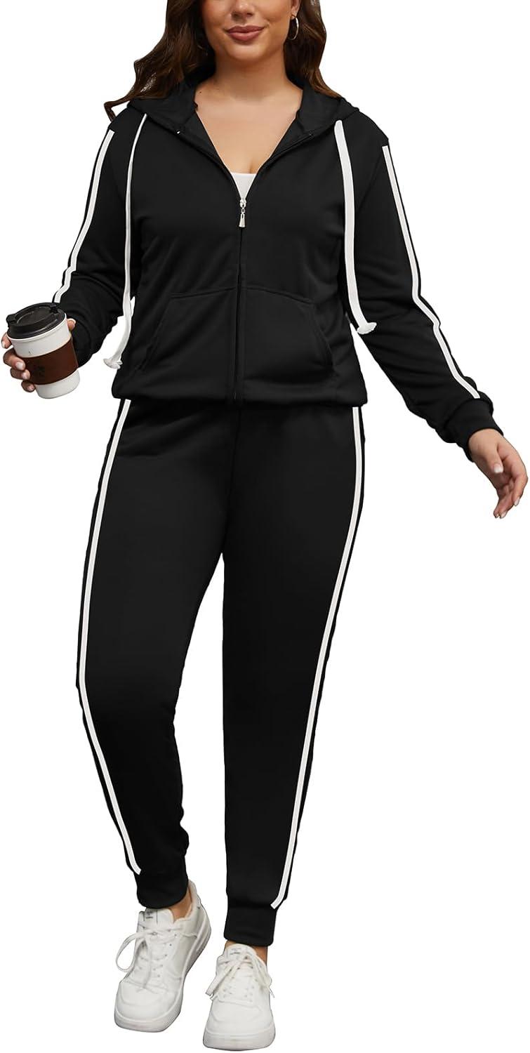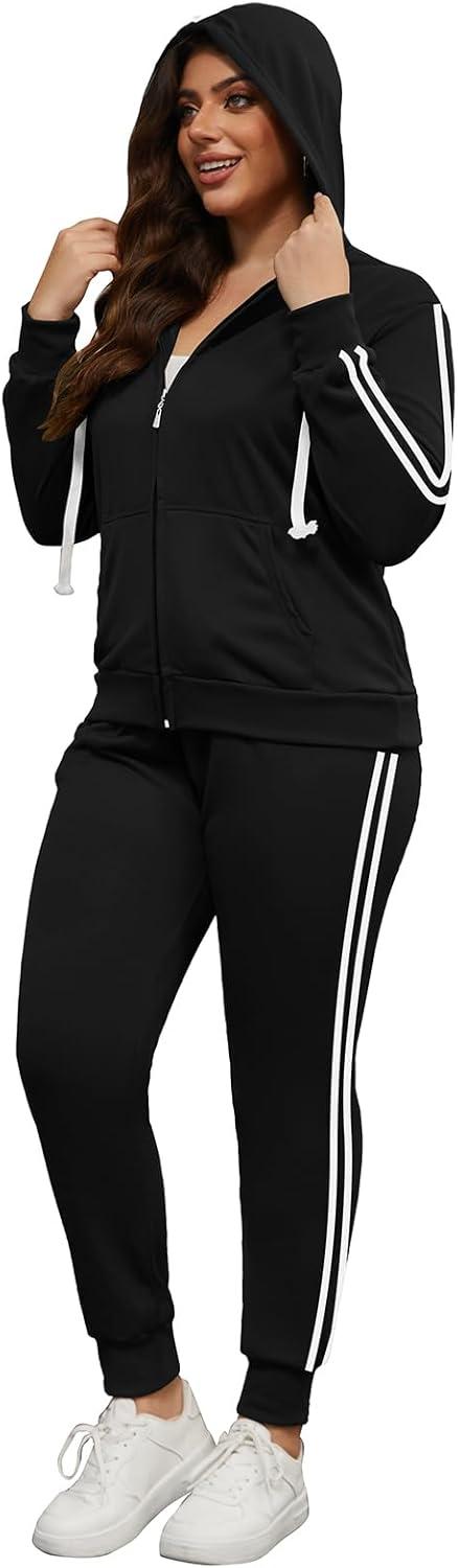 PINSV Women Plus Size 2 Piece Outfits Sweatsuits Full Zip Hooded Sweatshirt Sweatpants Tracksuits(C-black Stripe)