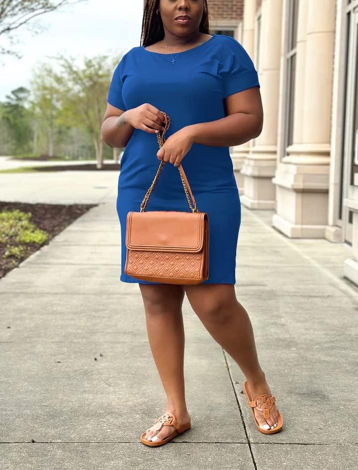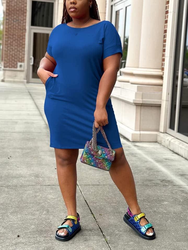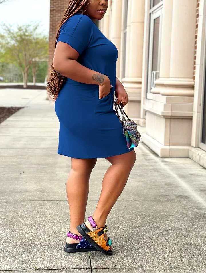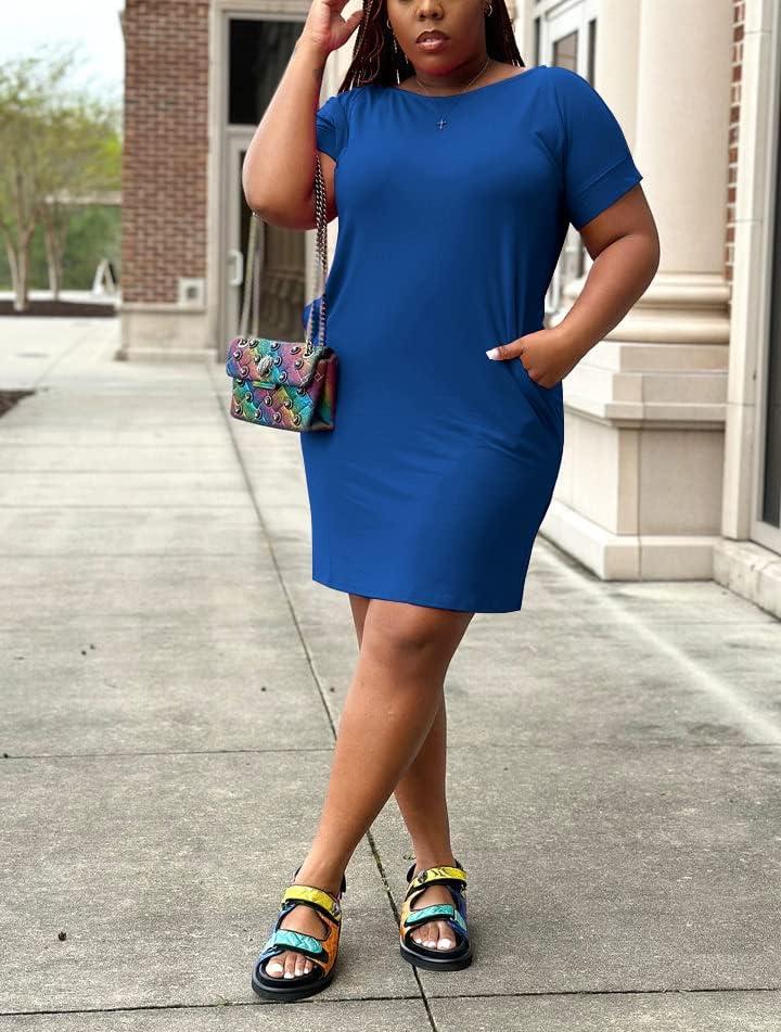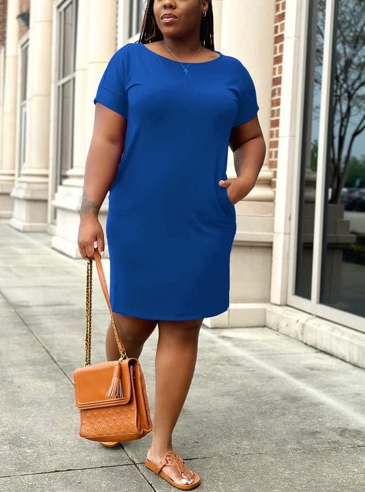 PINSV Women Plus Size Summer Casual T Shirt Dresses Short Sleeve Tunic Dress with Pockets Blue 3XL