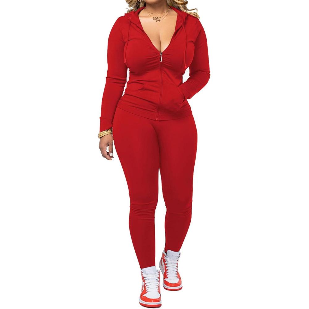 PINSV Women Two Piece Outfits Workout Sets Bodycon Tracksuit Long Sleeve Zip Up Hoodie Jacket Jogger Matching Sweat Pants Set Red A L