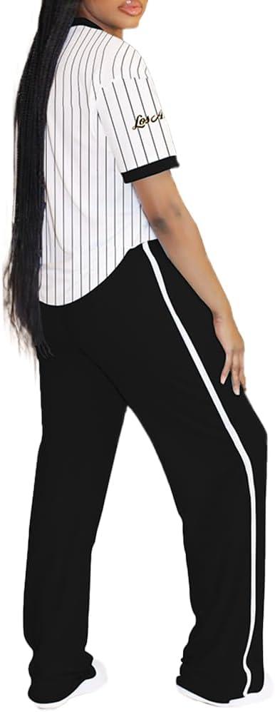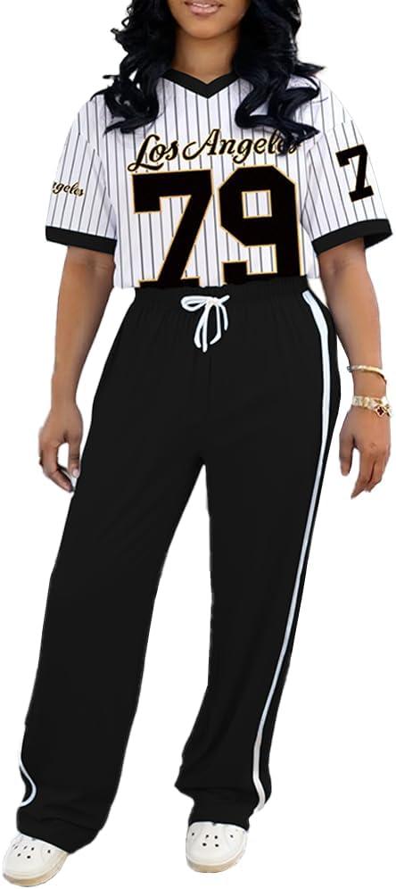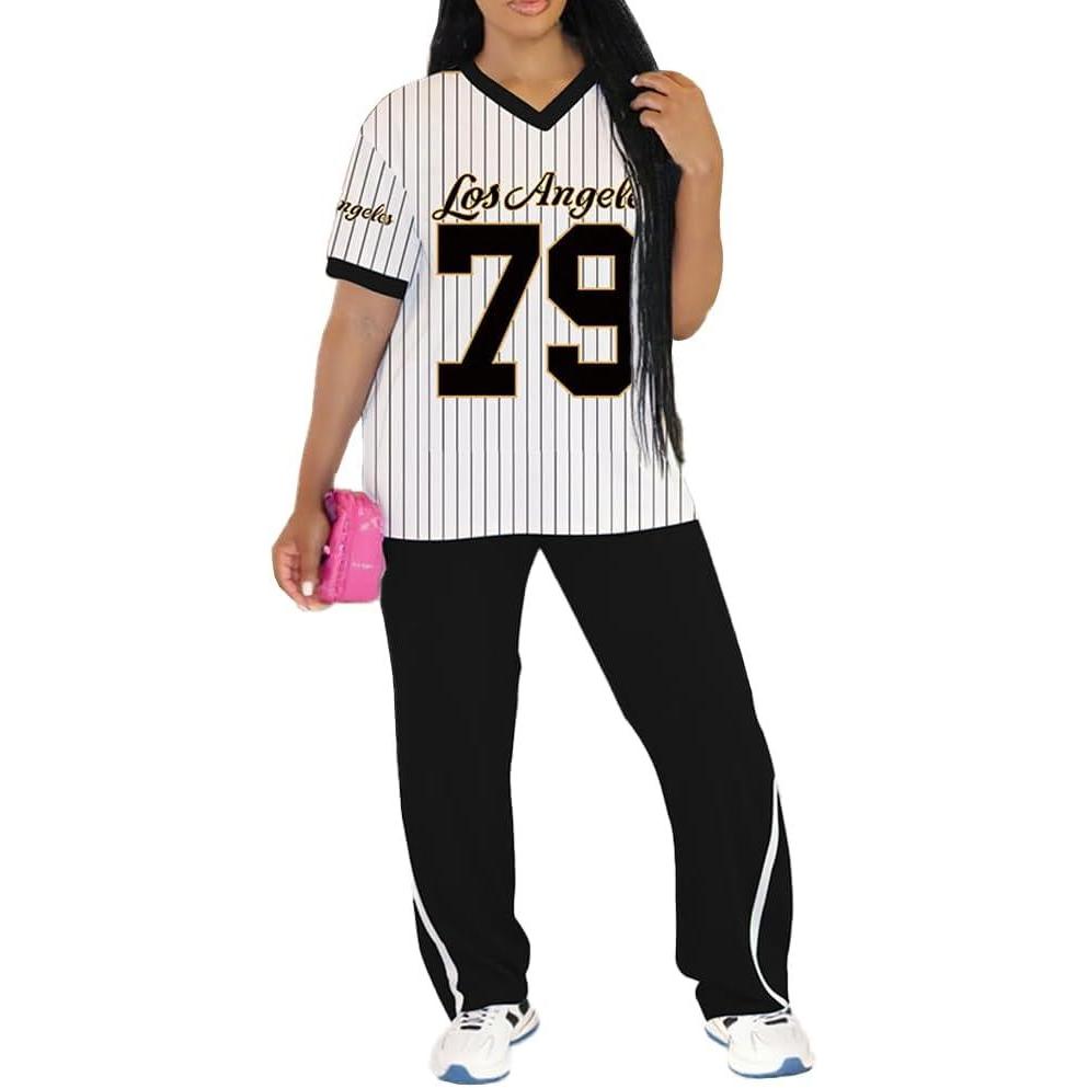 Women's 2 Piece Outfits Jersey Shirts Striped Number Graphic V Neck Tee and Pant Sets Casual Y2k Streetwear Tracksuits