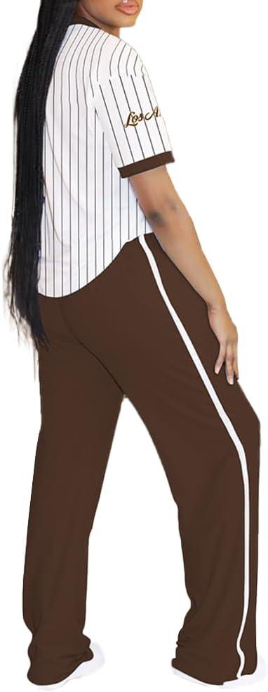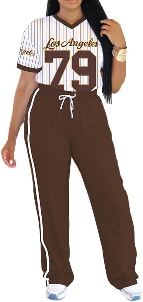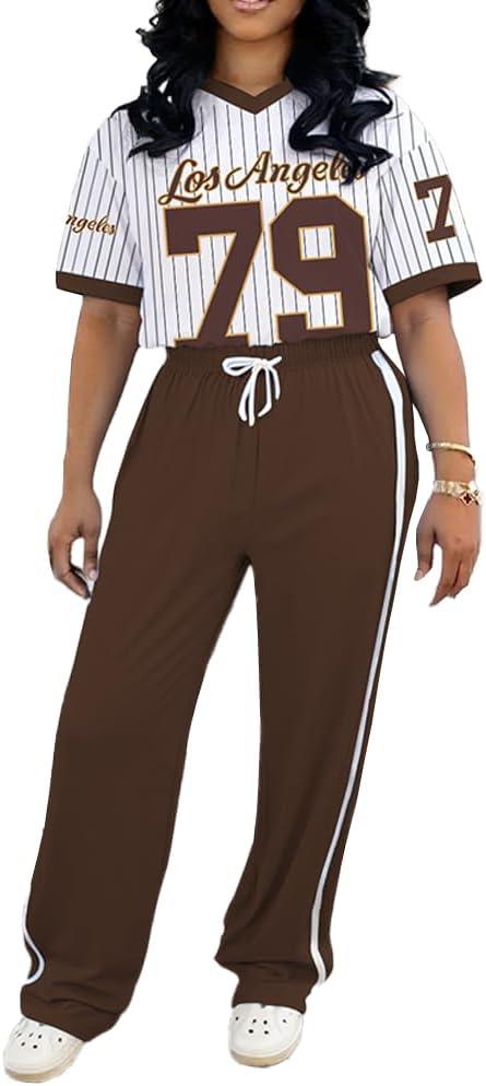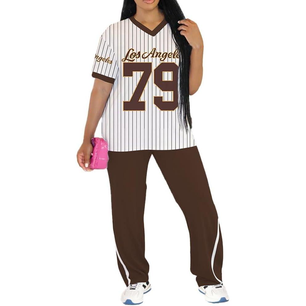 Women's 2 Piece Outfits Jersey Shirts Striped Number Graphic V Neck Tee and Pant Sets Casual Y2k Streetwear Tracksuits