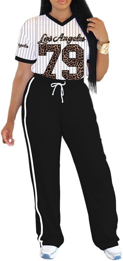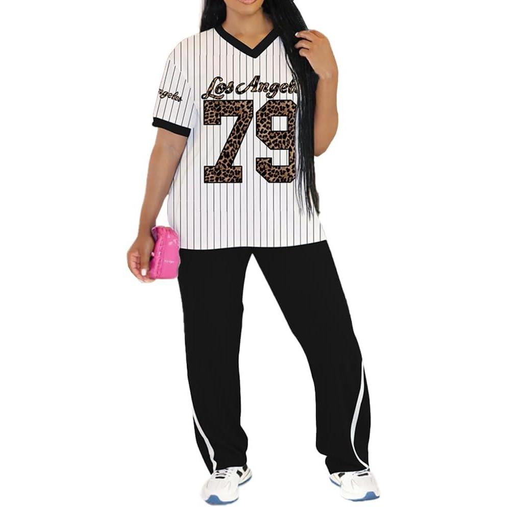 Women's 2 Piece Outfits Jersey Shirts Striped Number Graphic V Neck Tee and Pant Sets Casual Y2k Streetwear Tracksuits