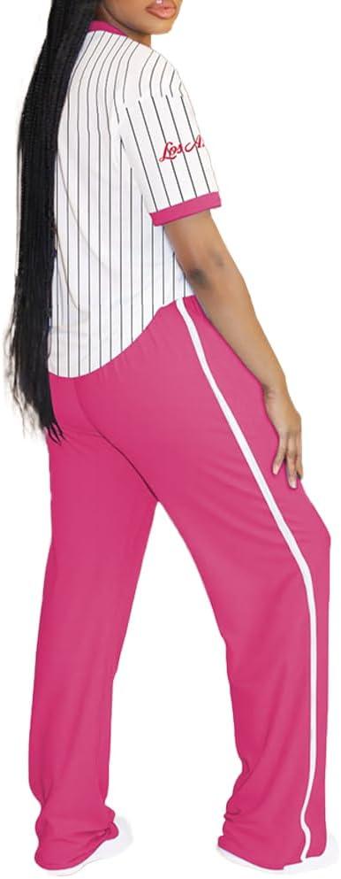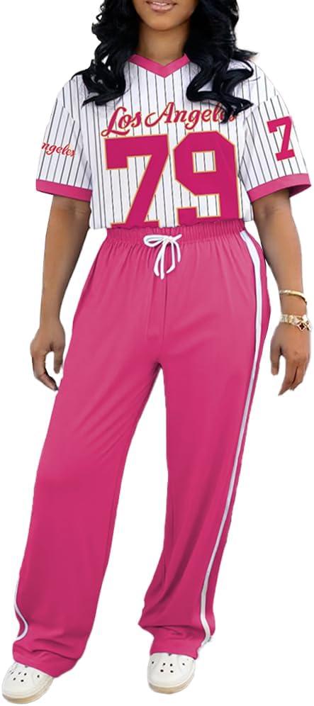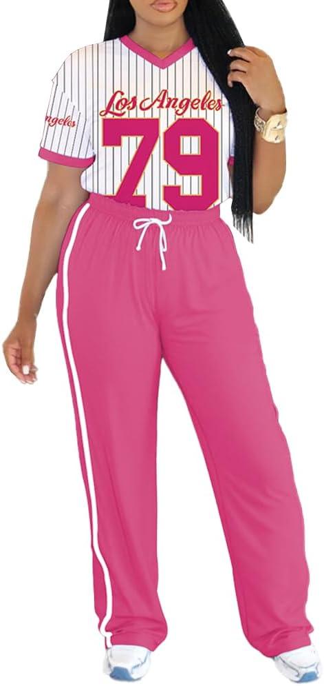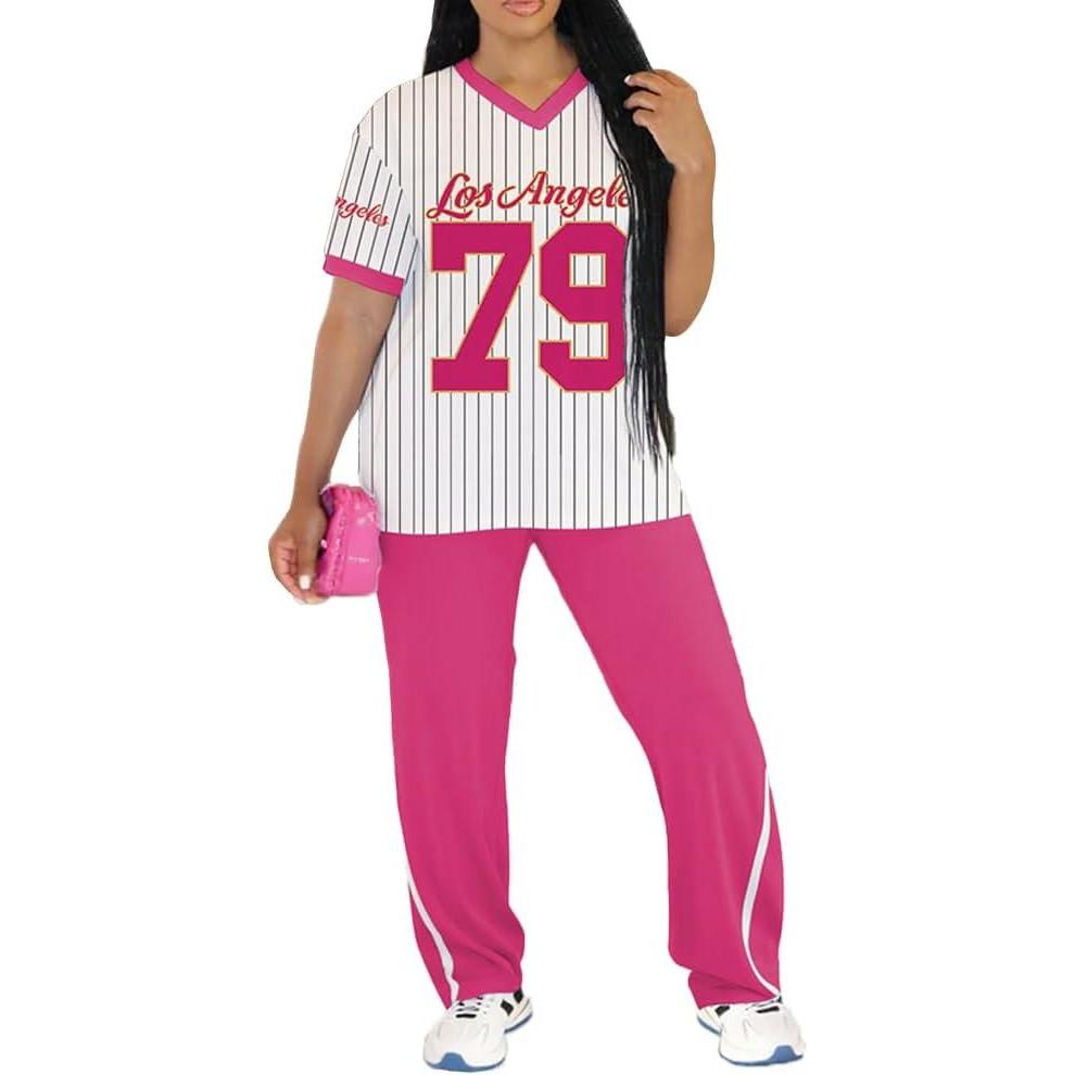 Women's 2 Piece Outfits Jersey Shirts Striped Number Graphic V Neck Tee and Pant Sets Casual Y2k Streetwear Tracksuits