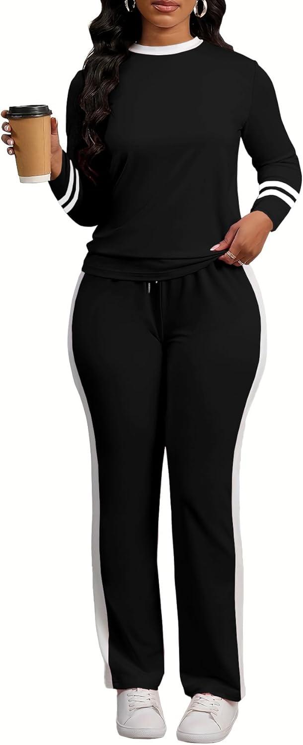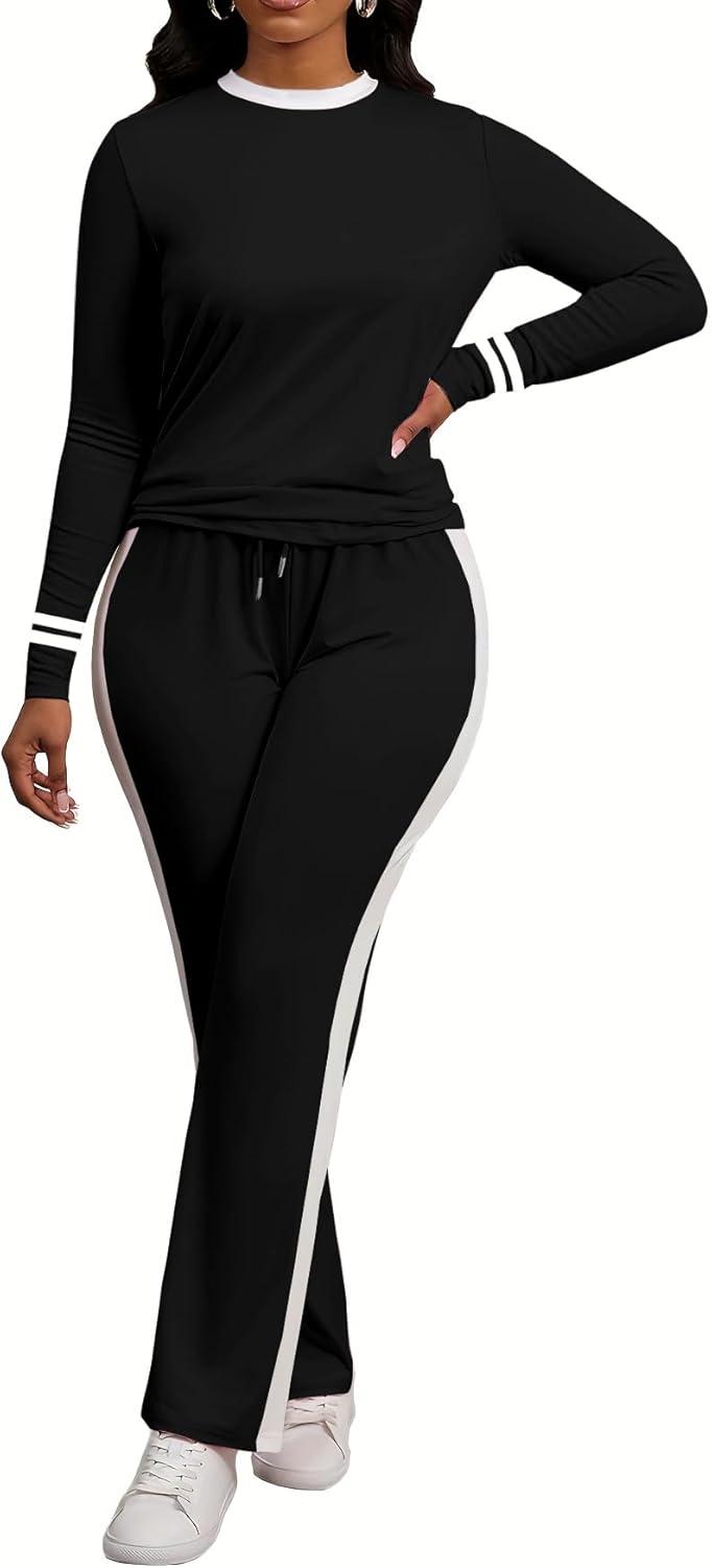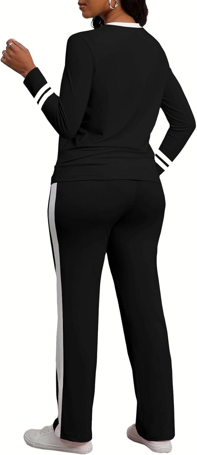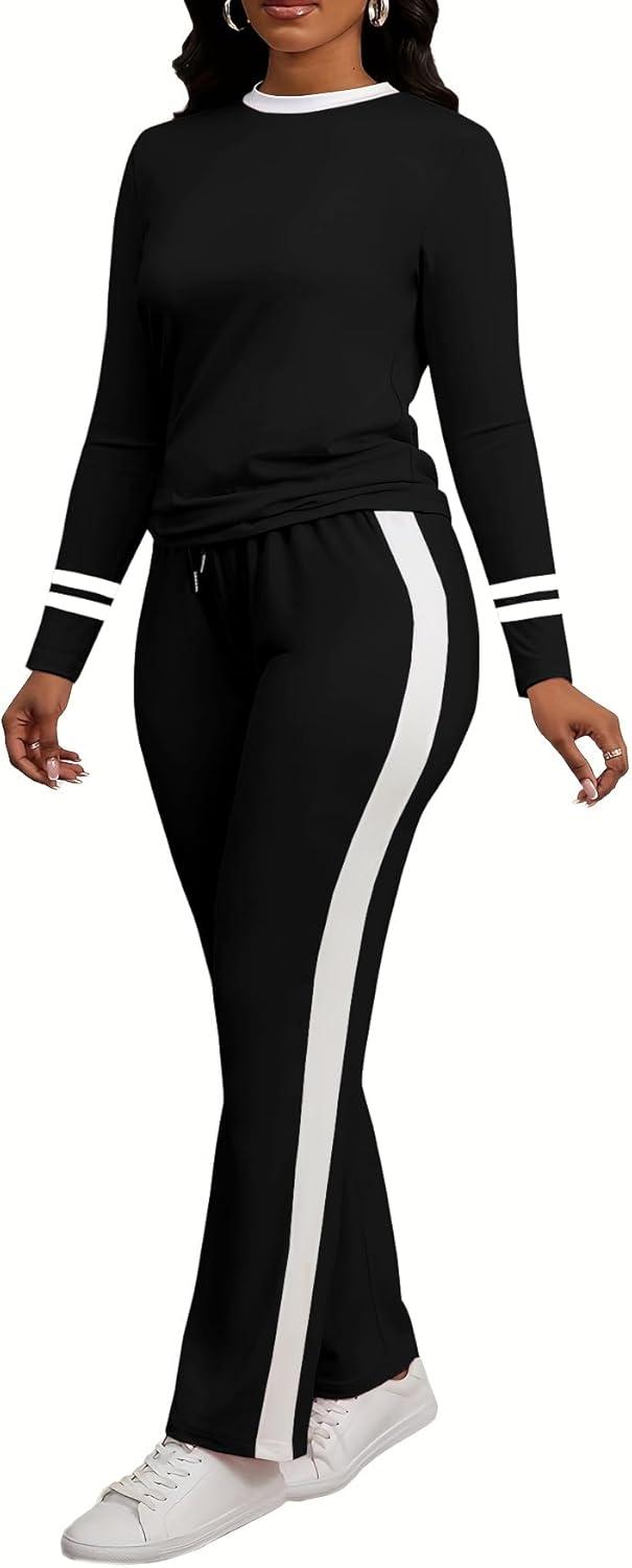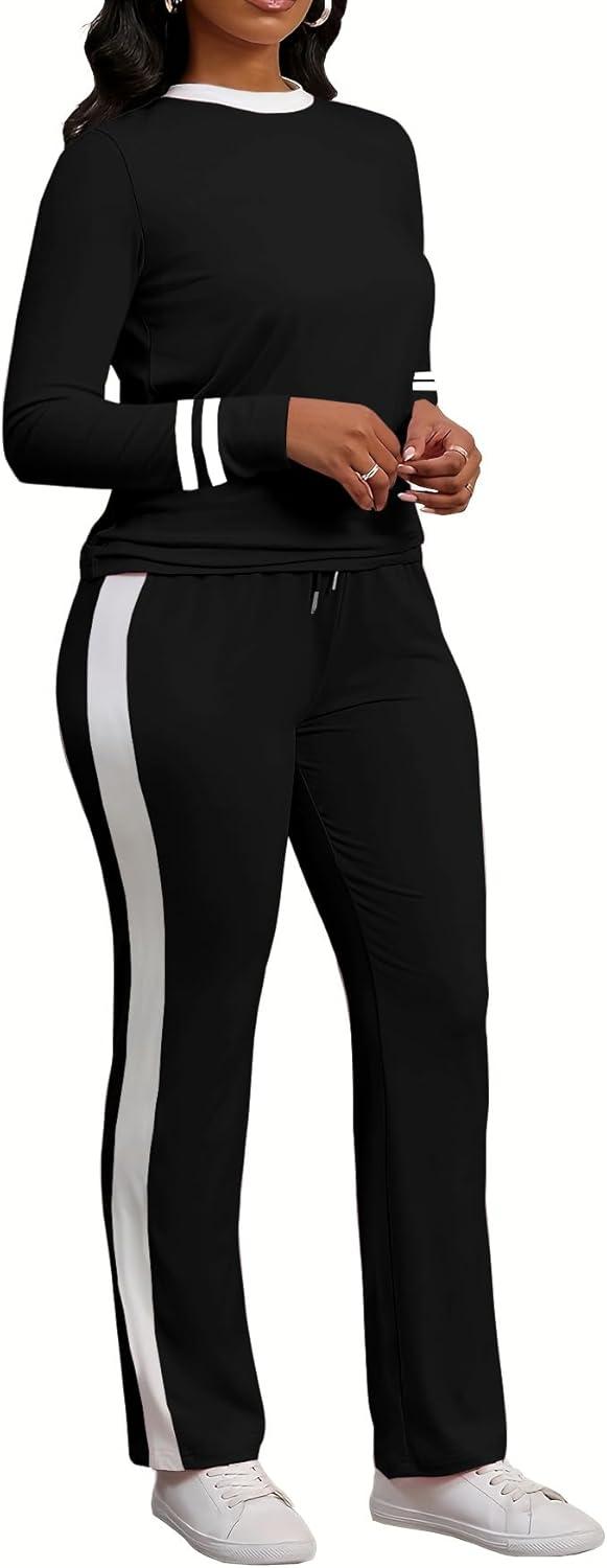PINSV Women’s 2 Piece Outfits Long Sleeve Tops Sweatpants Colorblock Bodycon Lounge Sets Tracksuits(Black)