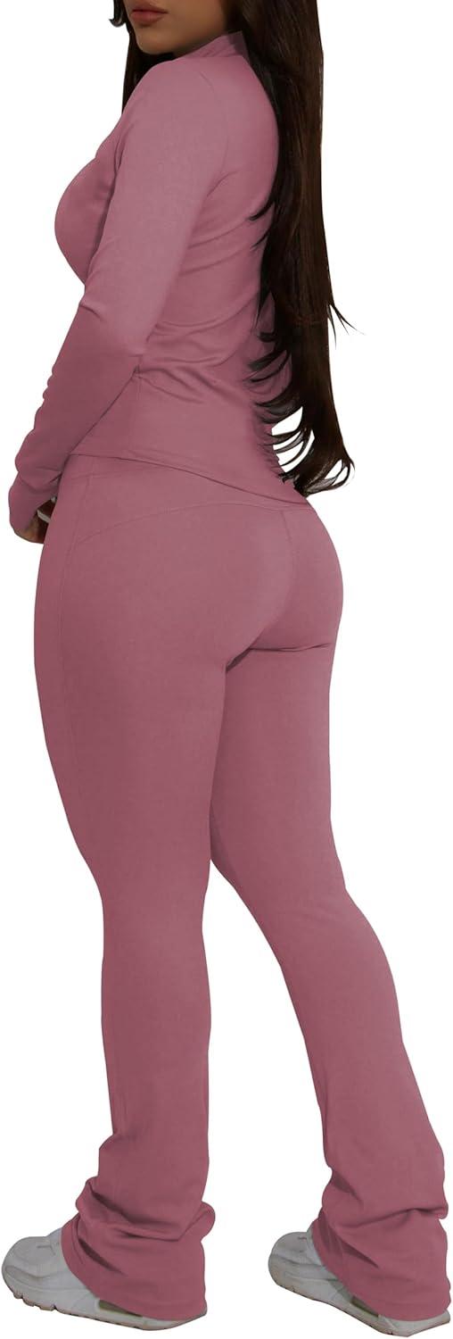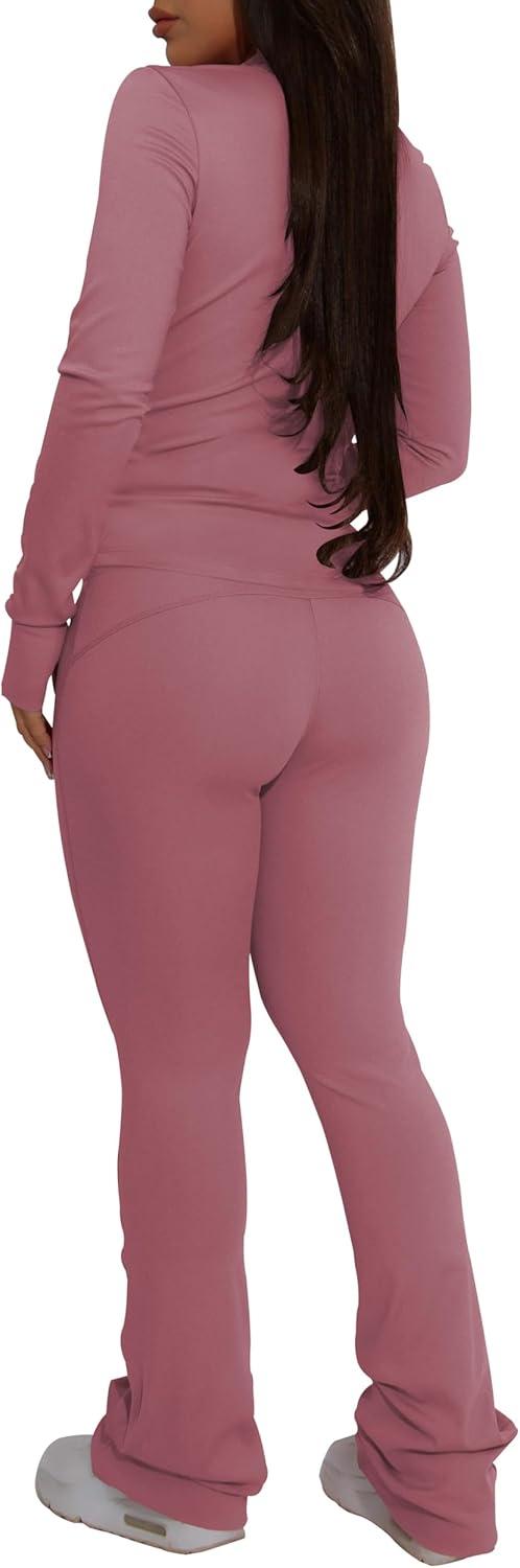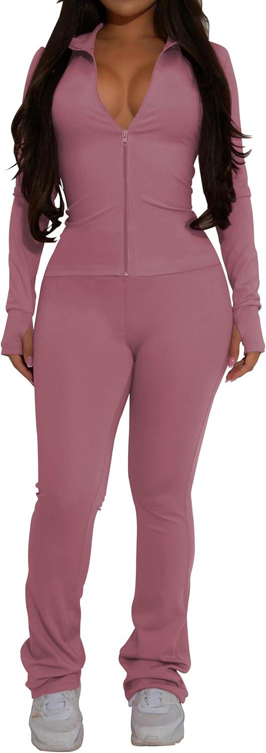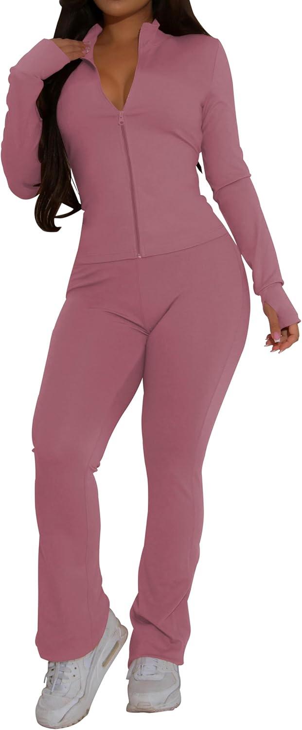 PINSV Women’s 2 Piece Outfits Long Sleeve Zip Up Jacket Flare Pants Matching Tracksuit Set(Dusty Pink)