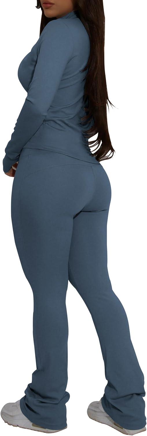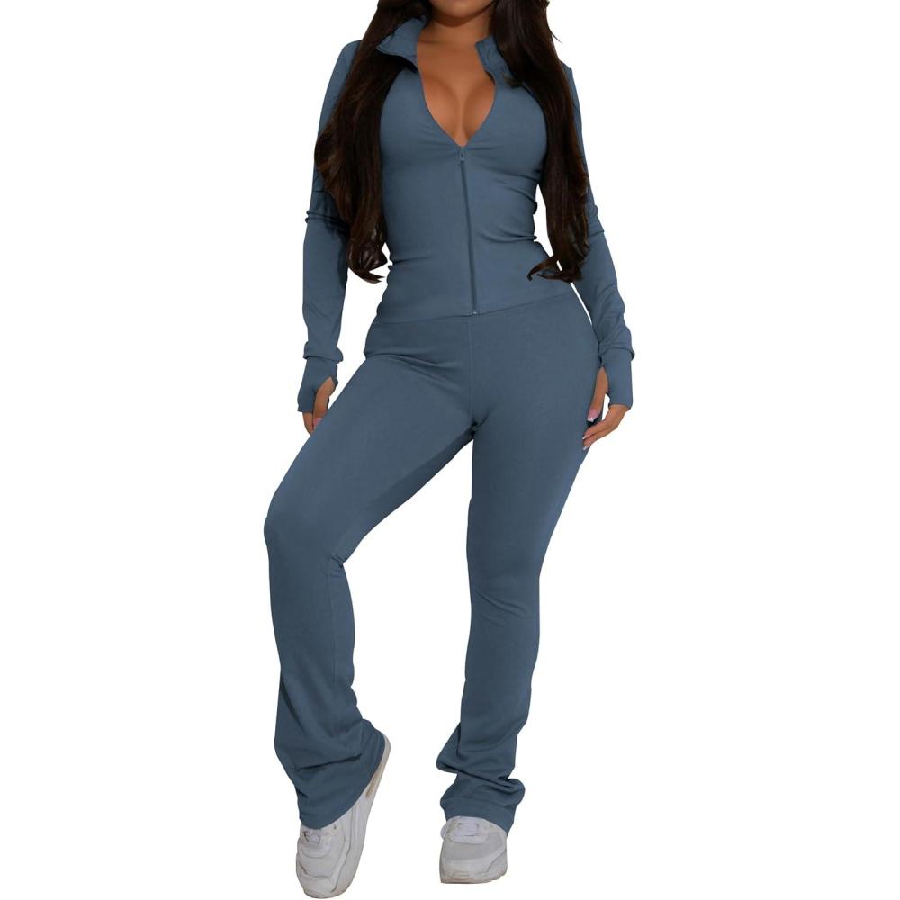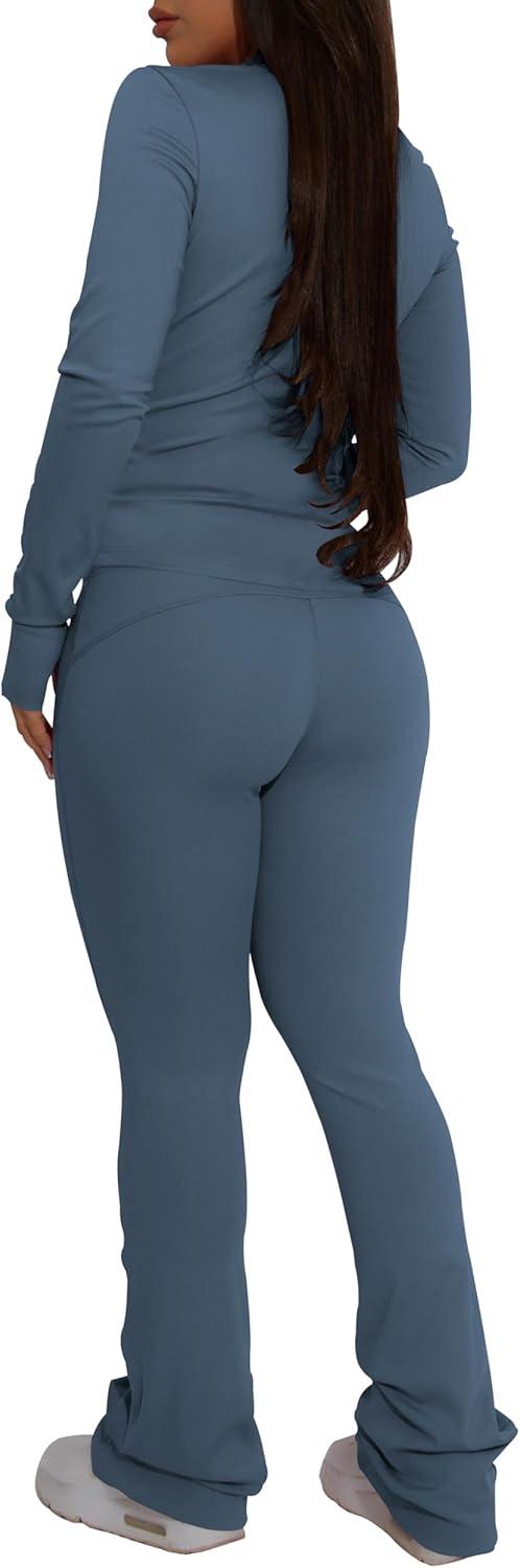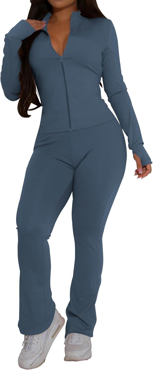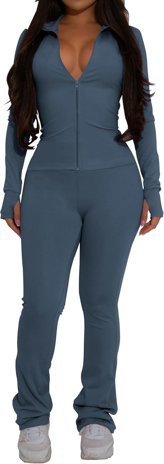 PINSV Women’s 2 Piece Outfits Long Sleeve Zip Up Jacket Flare Pants Matching Tracksuit Set(Grey Blue)