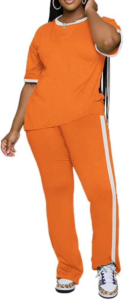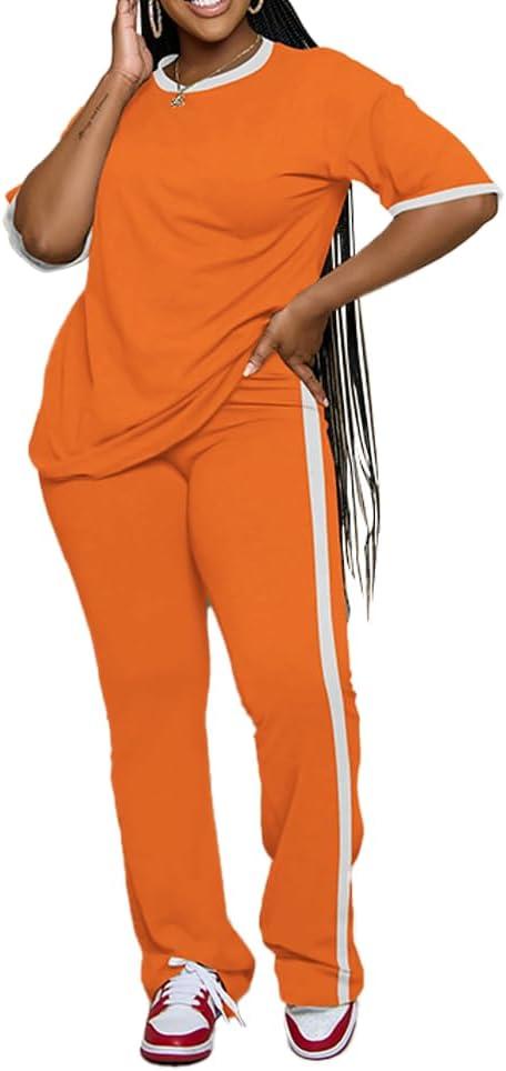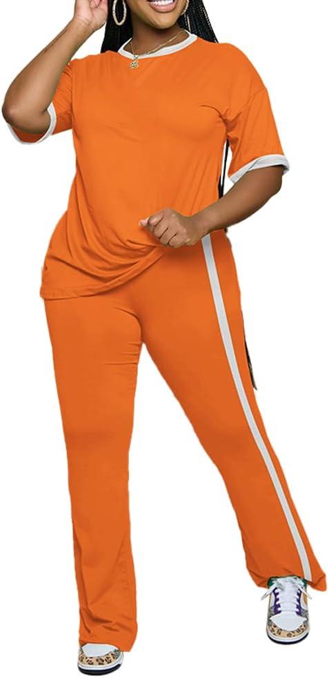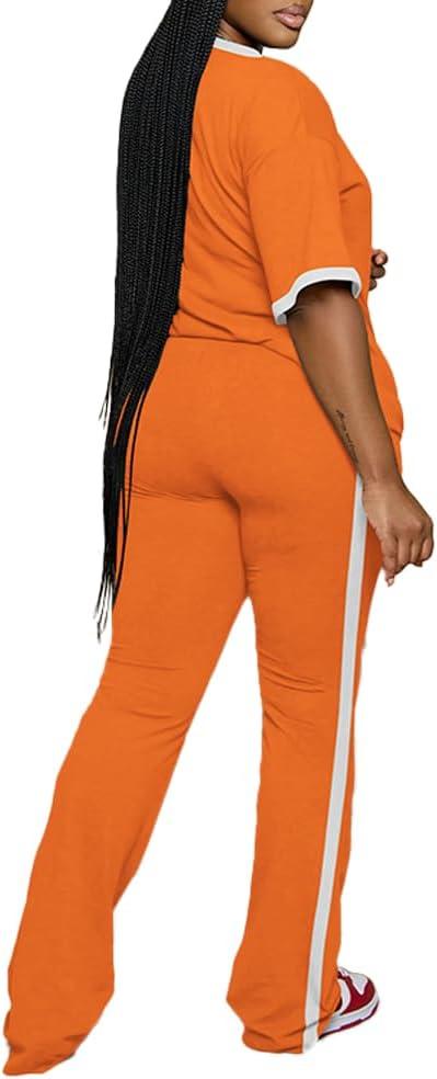 PINSV Womens 2 Piece Outfits Sets Short Sleeve Top and Flare Pants Lounge Sets Track suit(Orange)