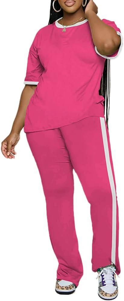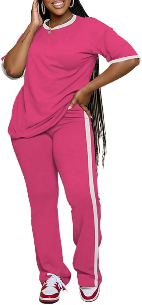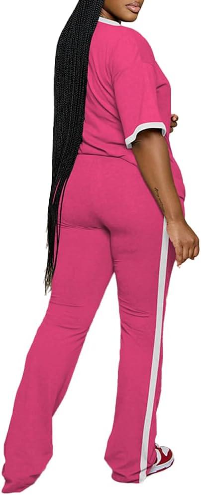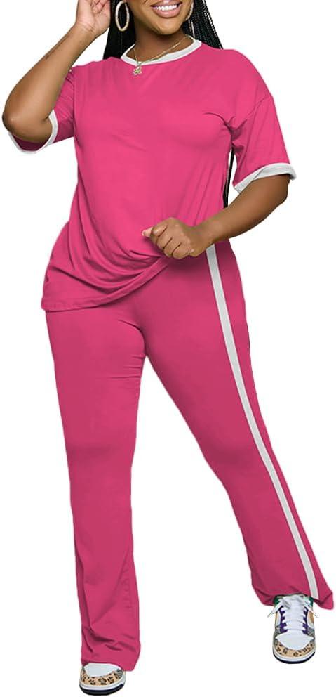 PINSV Womens 2 Piece Outfits Sets Short Sleeve Top and Flare Pants Lounge Sets Track suit(Rose Red)