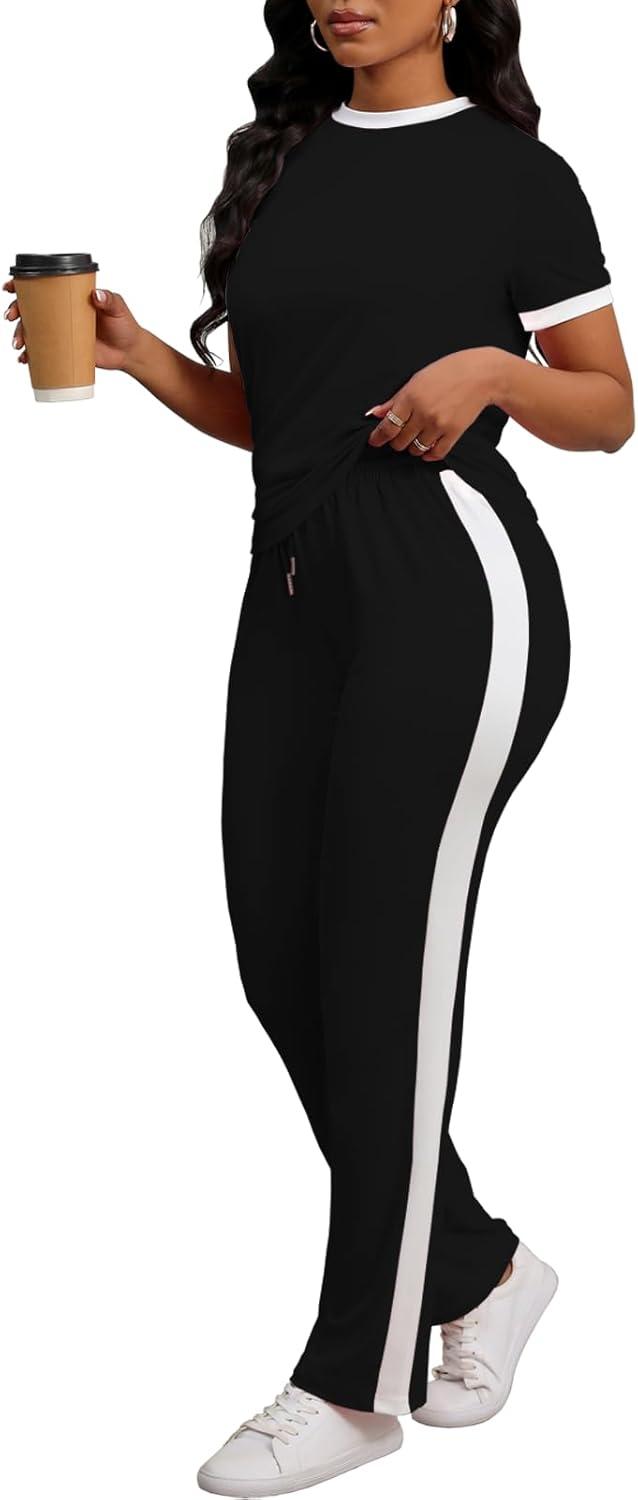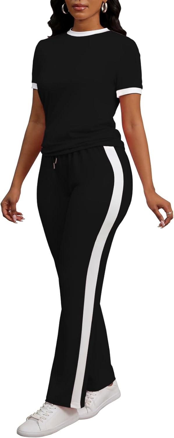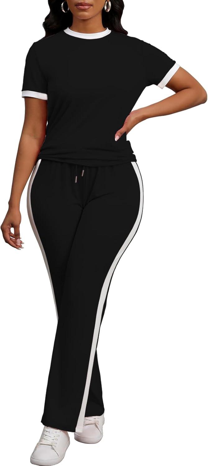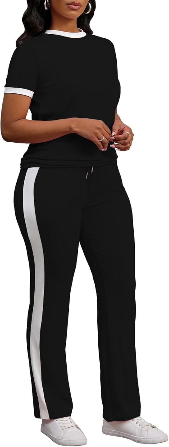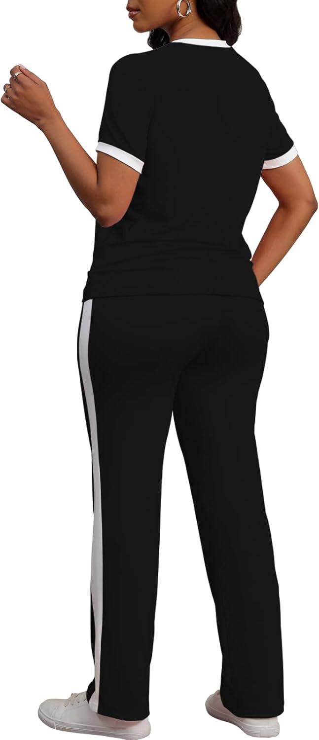 PINSV Women’s 2 Piece Outfits Short Sleeve Tops Sweatpants Colorblock Bodycon Lounge Sets Tracksuit(Black)