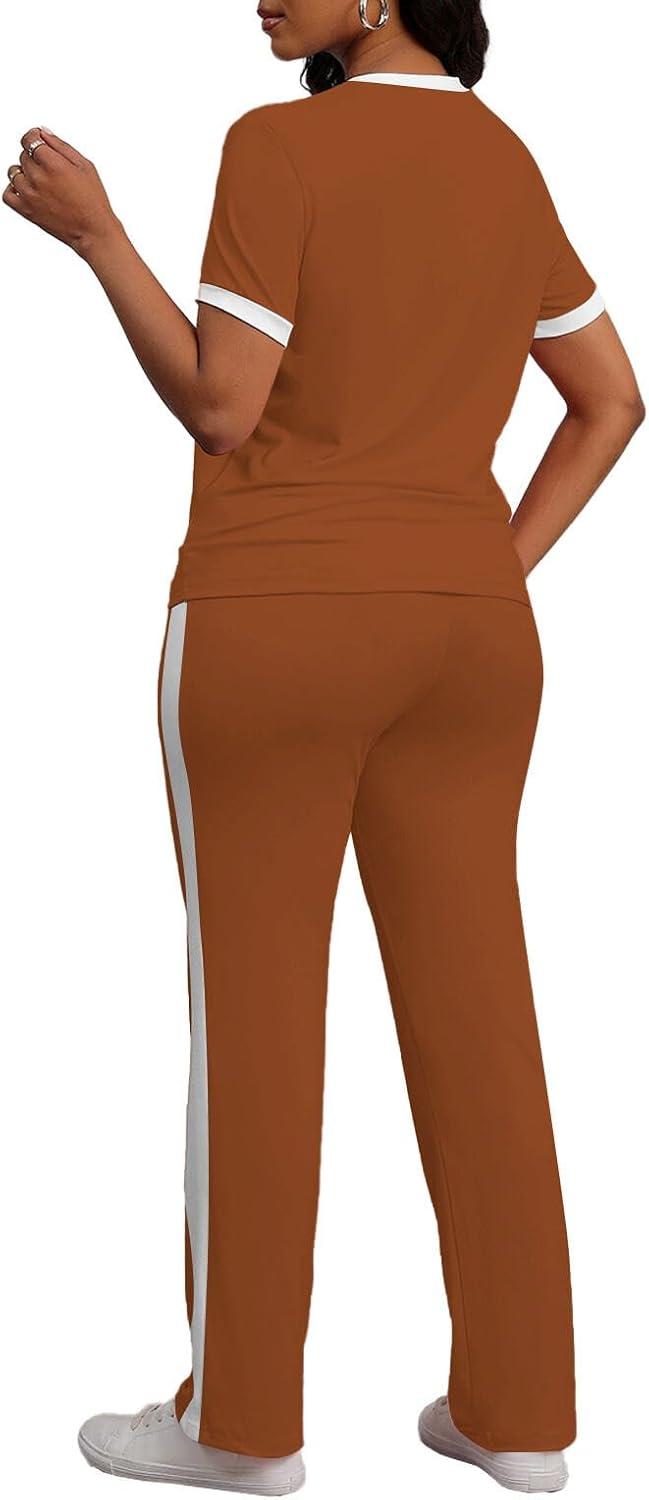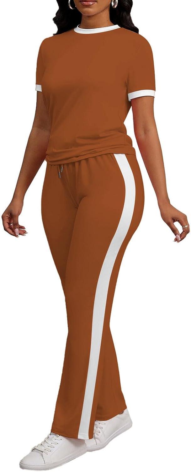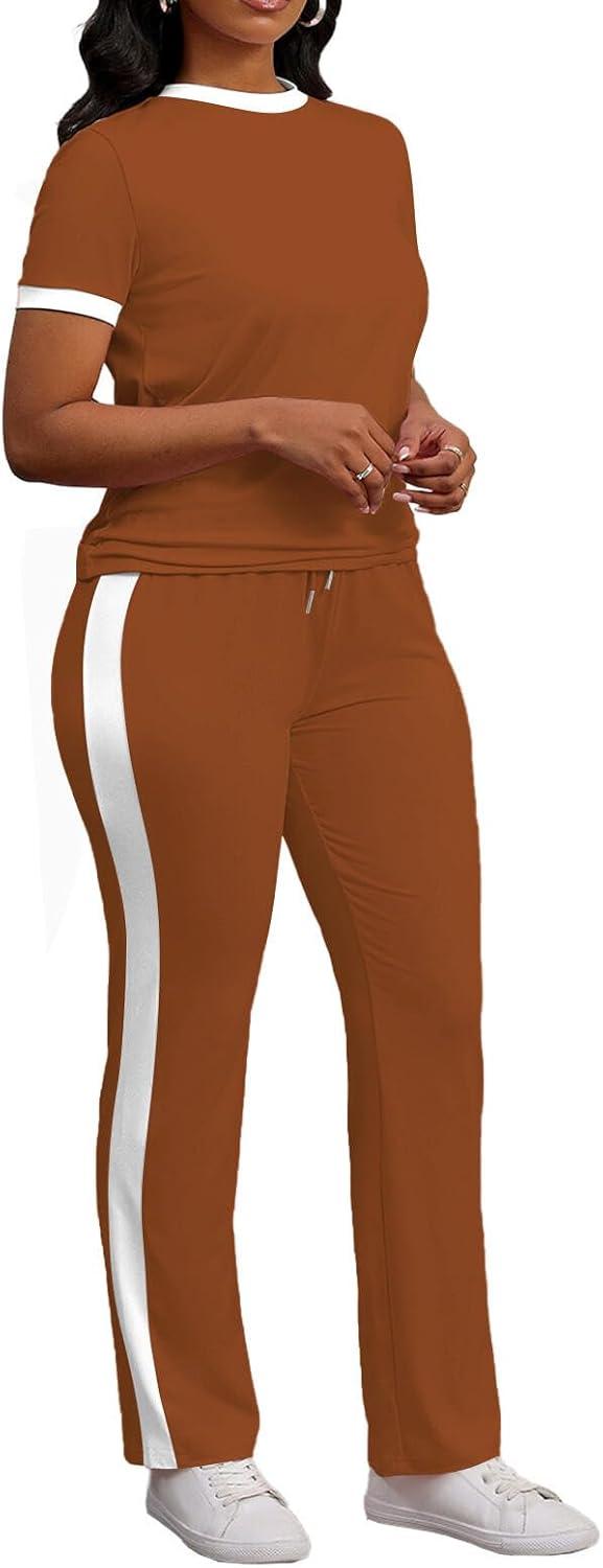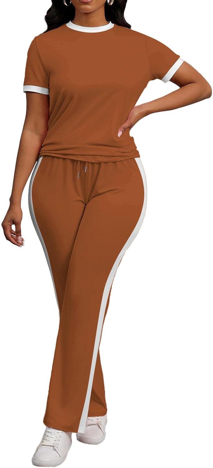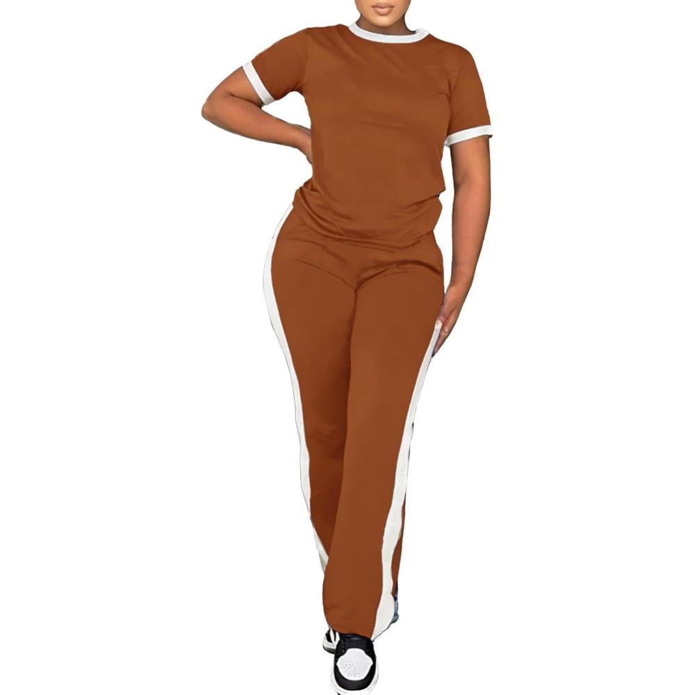 PINSV Women’s 2 Piece Outfits Short Sleeve Tops Sweatpants Colorblock Bodycon Lounge Sets Tracksuit(Brown)