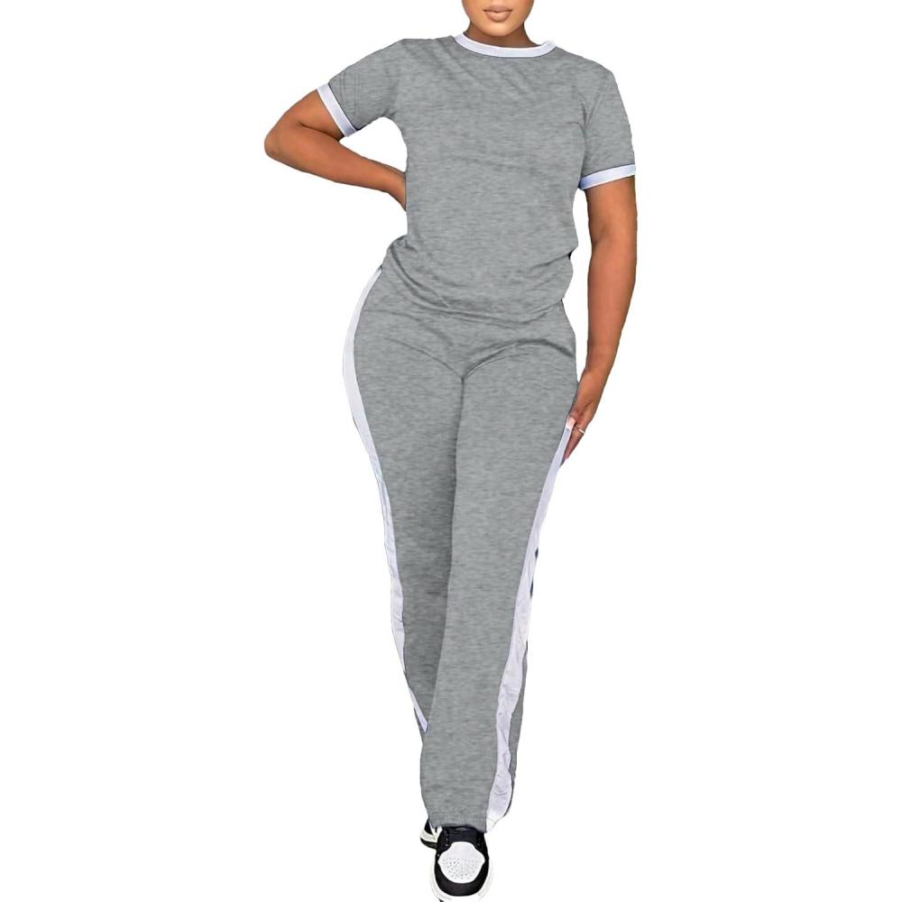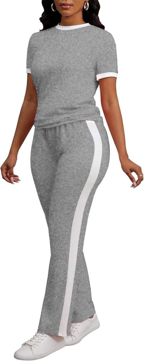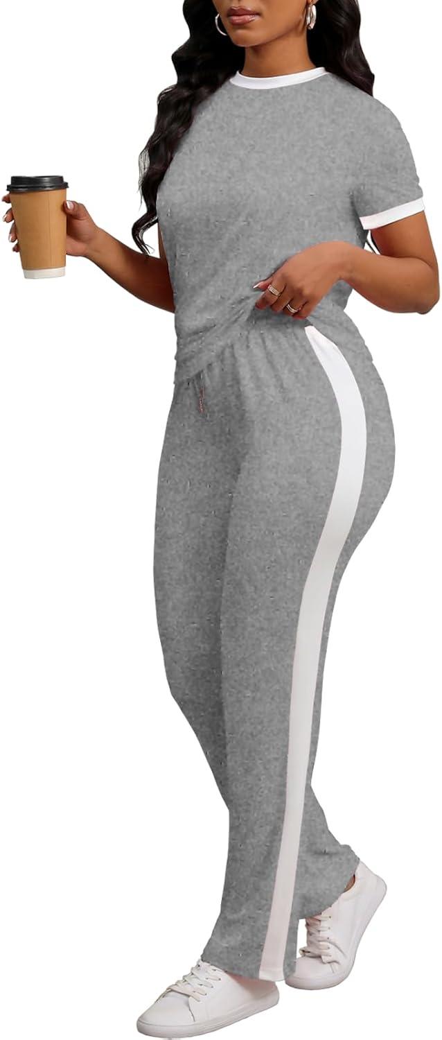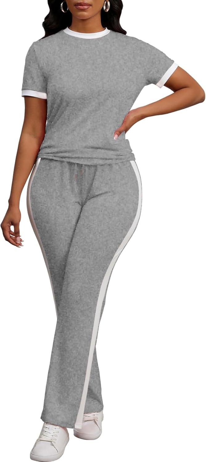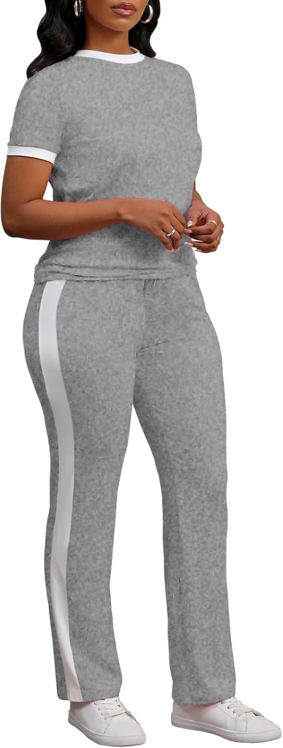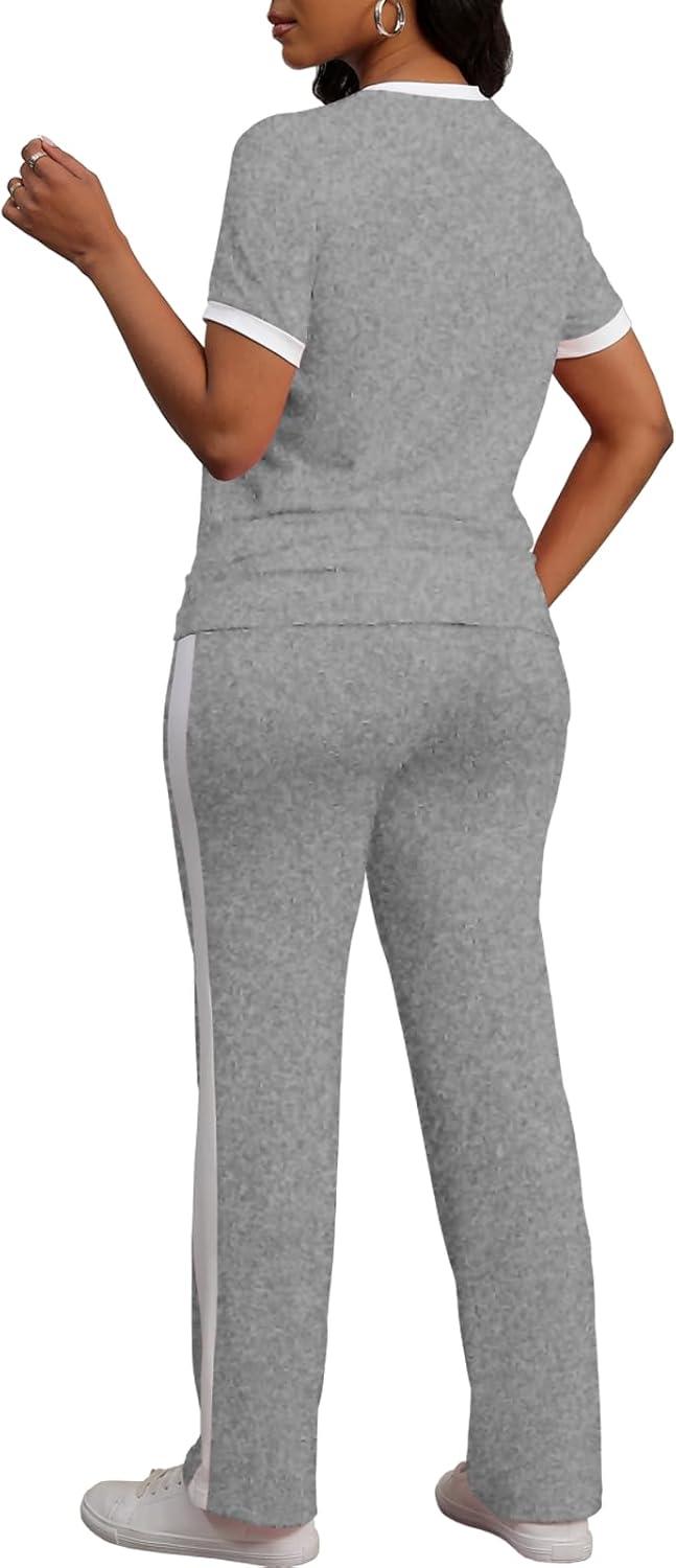 PINSV Women’s 2 Piece Outfits Short Sleeve Tops Sweatpants Colorblock Bodycon Lounge Sets Tracksuit(Gray)
