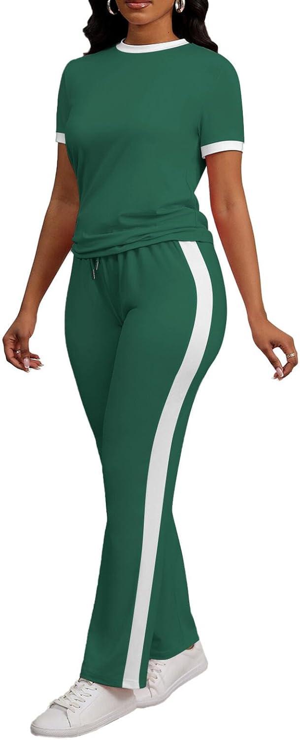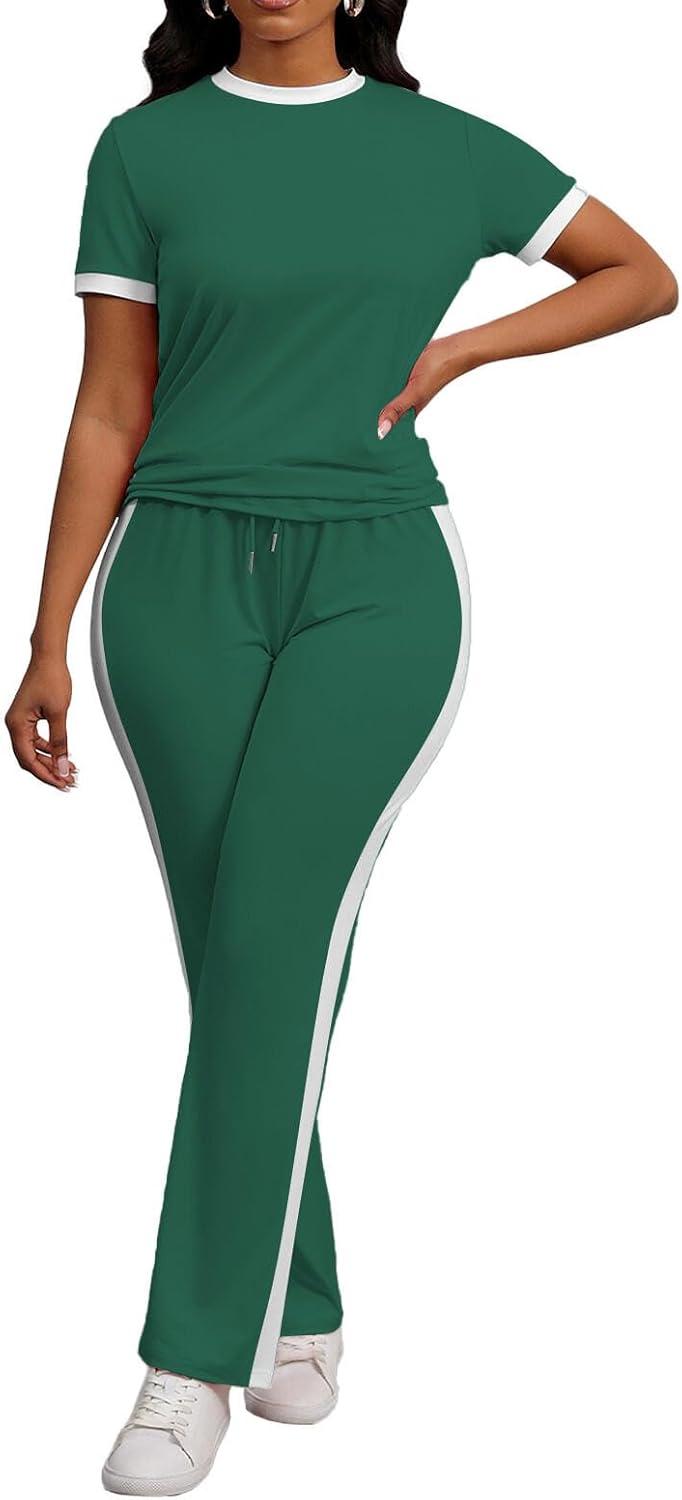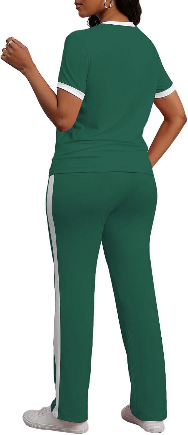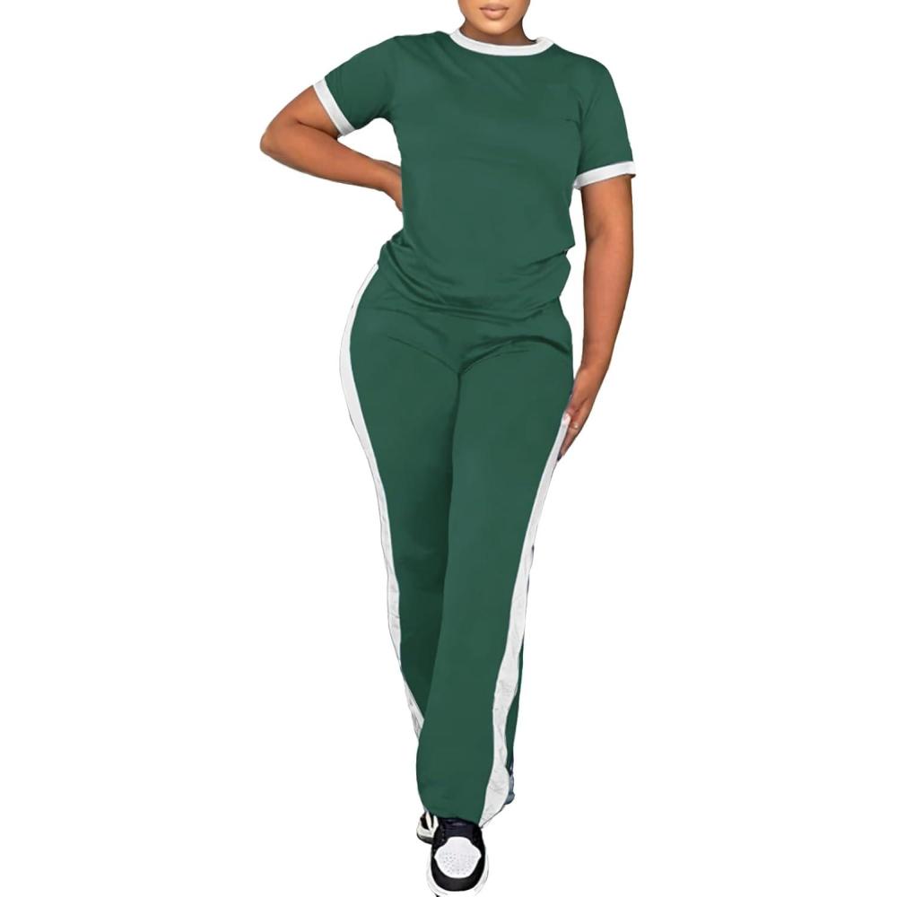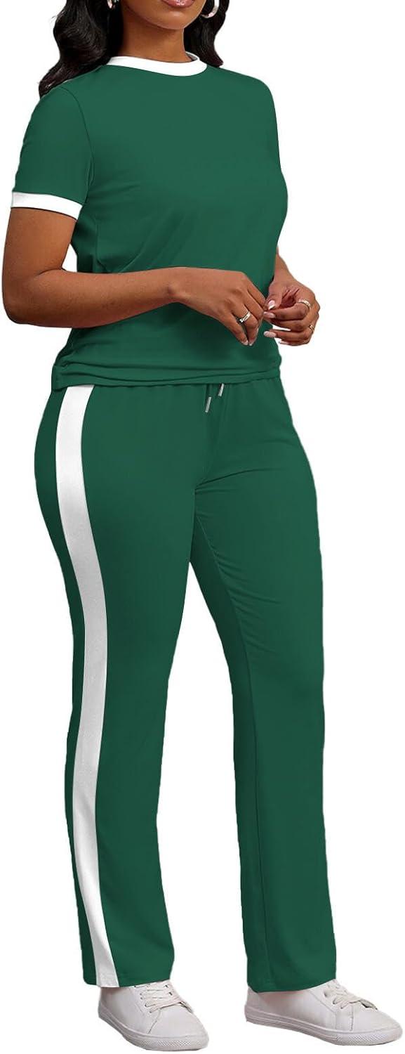 PINSV Women’s 2 Piece Outfits Short Sleeve Tops Sweatpants Colorblock Bodycon Lounge Sets Tracksuit(Green)