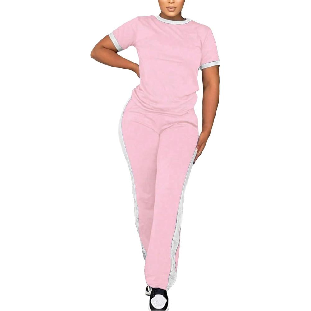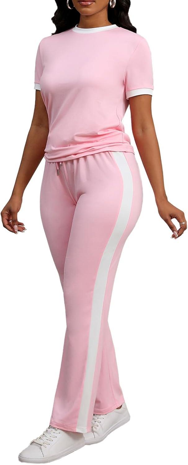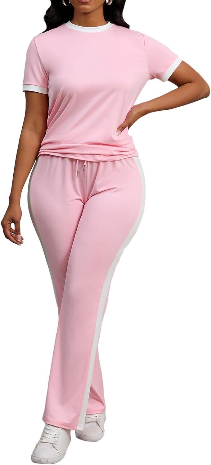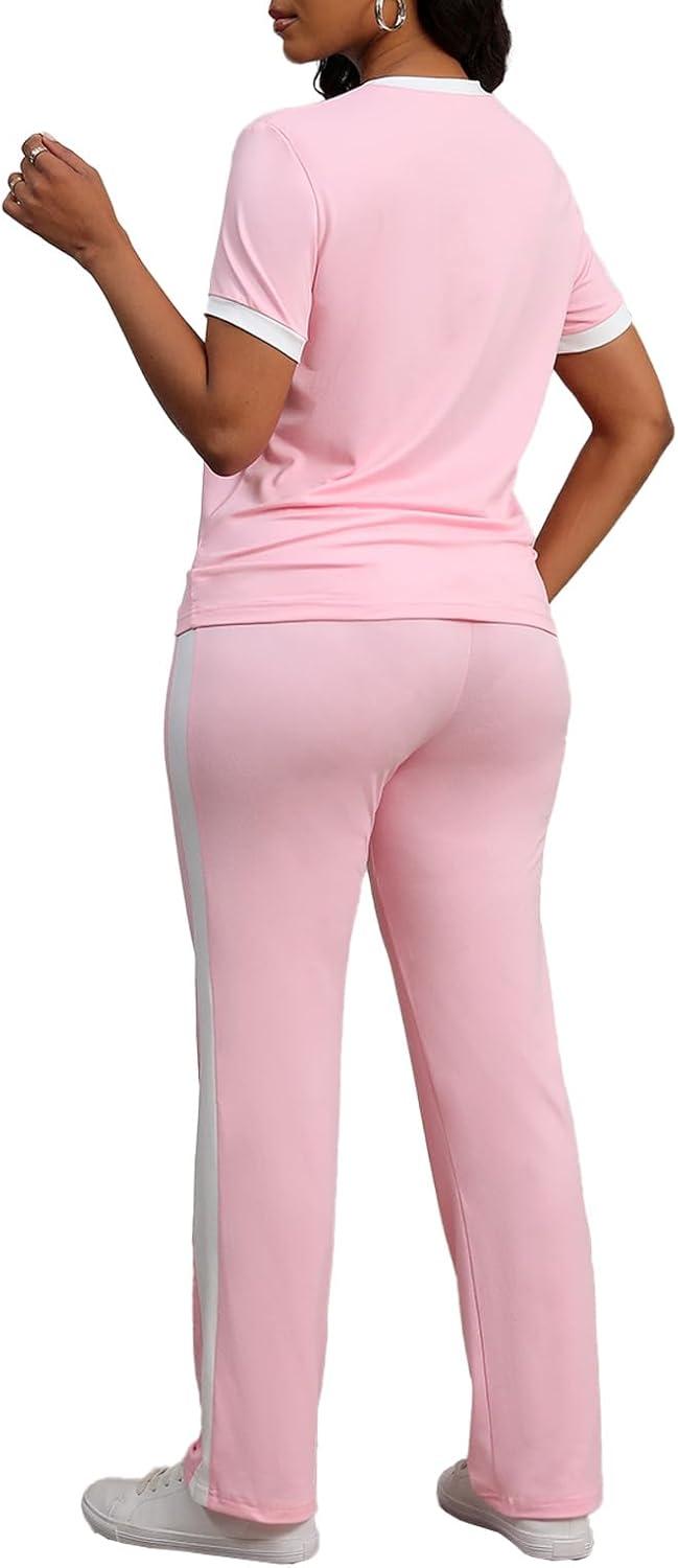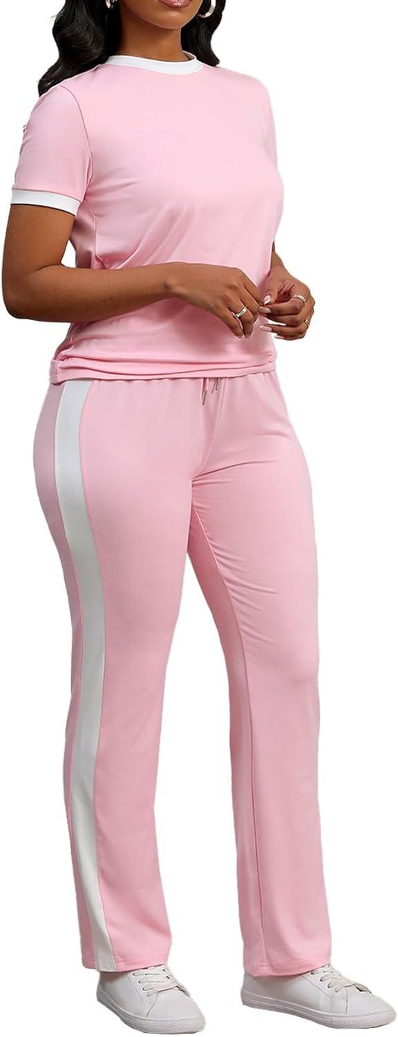 PINSV Women’s 2 Piece Outfits Short Sleeve Tops Sweatpants Colorblock Bodycon Lounge Sets Tracksuit(Pink)