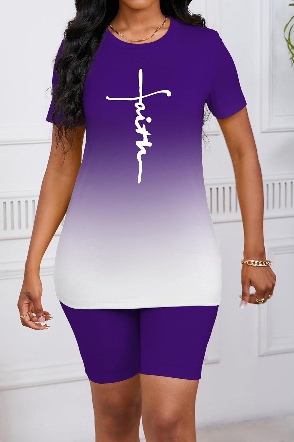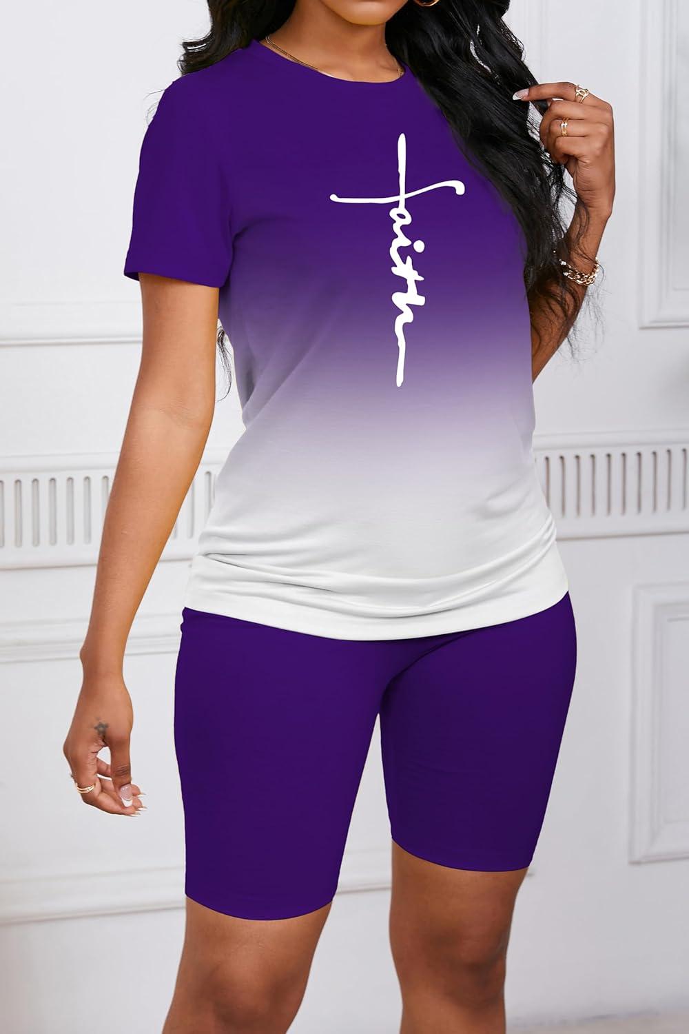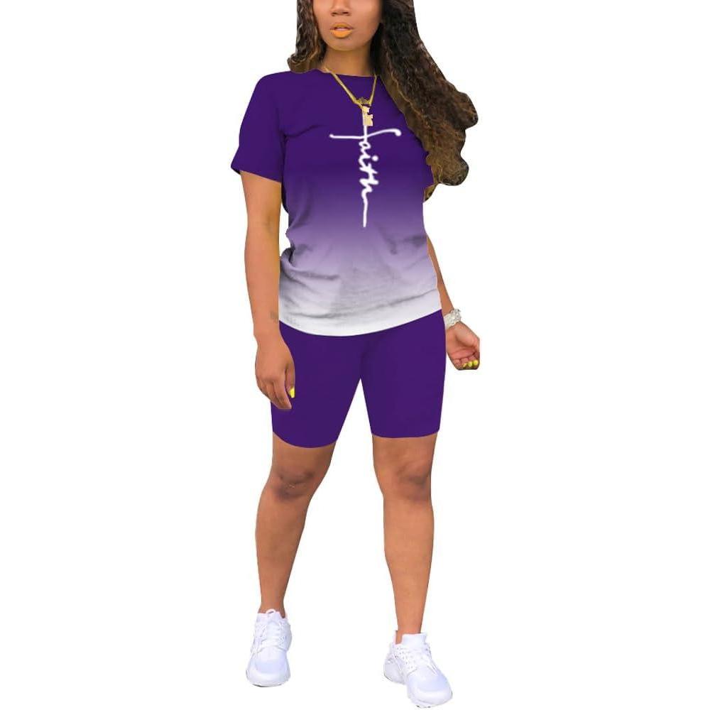PINSV Women’S 2 Piece Outfits Summer Printing Bodycon Short Pants Workout Sets Two Tracksuit Tshirt Shorts Jogger Set Purple Gradient Letter Print A XXL