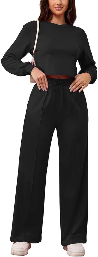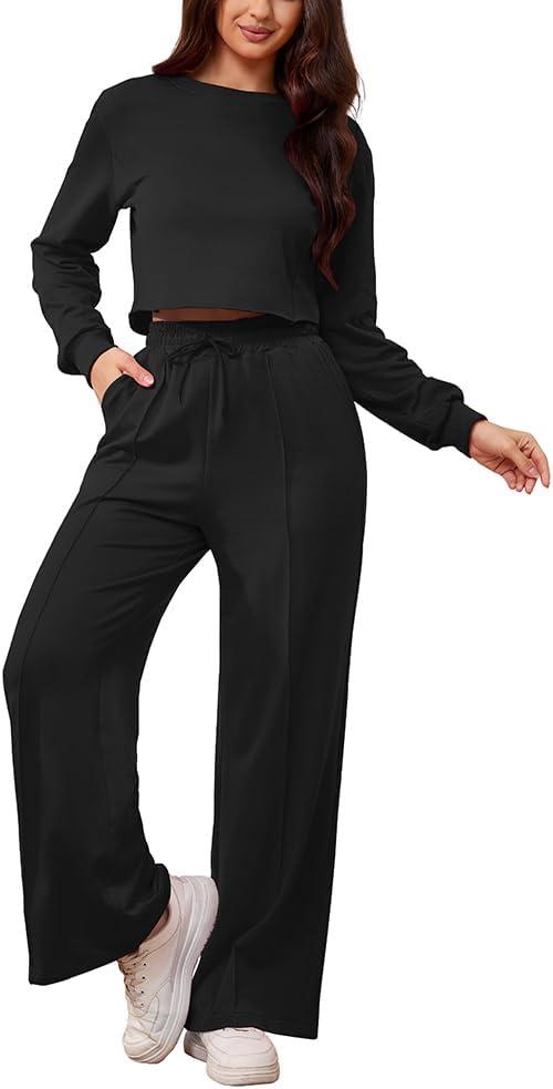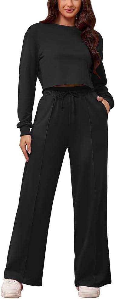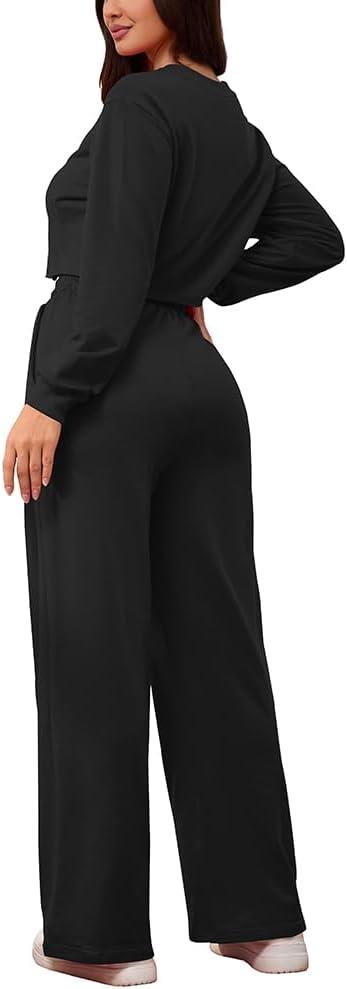 Women's 2 Piece Outfits Sweatsuit Set Long Sleeve Crop Top Drawstring Wide Leg Pants with Pockets Track Suits Casual Sets